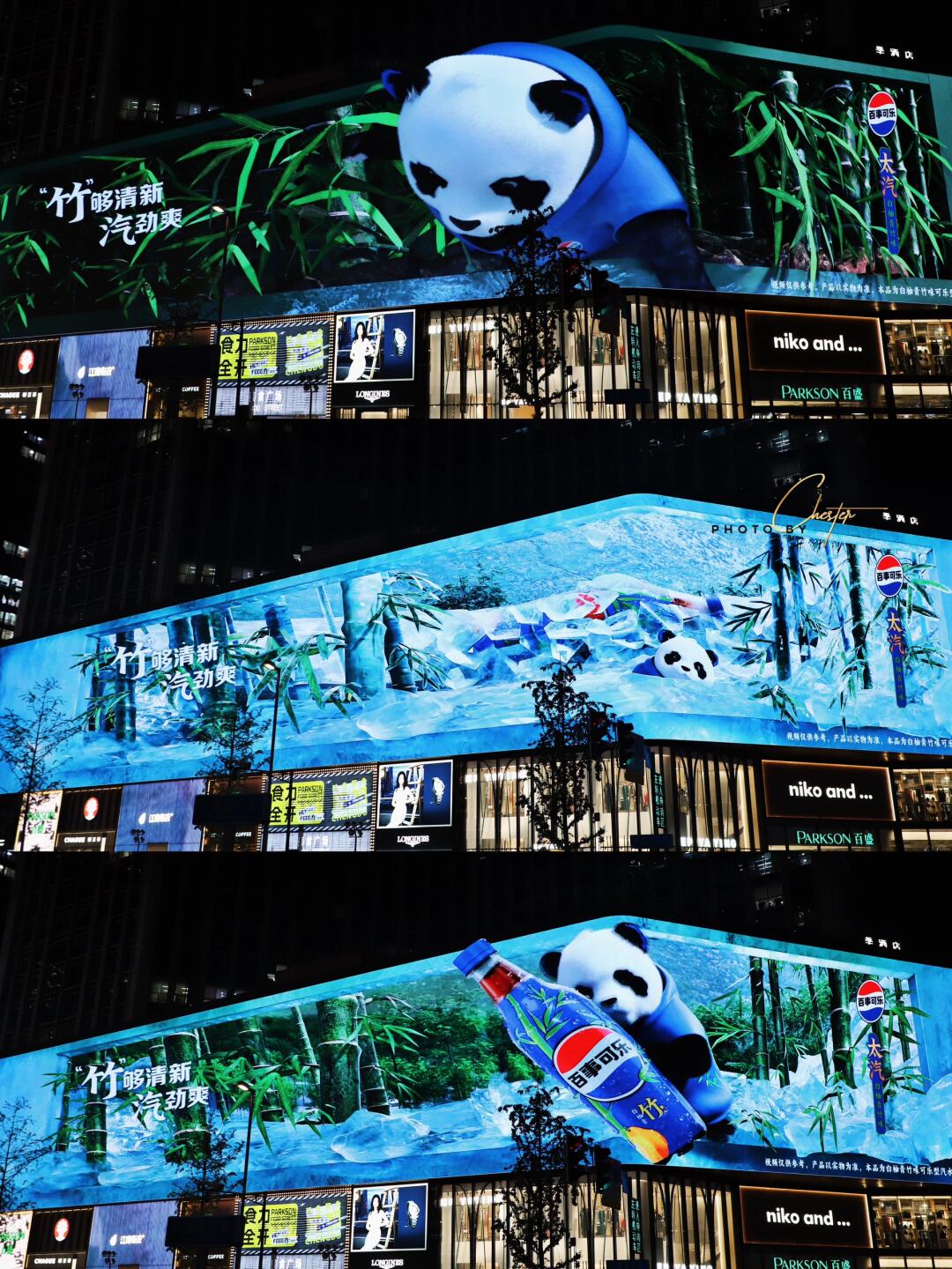 太可爱啦暑假结束啦, 快来成都错峰旅行‼️ 建议到成都的第一件事, 就是先把满大街的熊猫拍个遍~ 呐,超全的熊猫打卡攻略, 作业给你抄~ . 1️⃣春熙路百盛购物中心3D大屏 和百事可乐太汽系列联动 赛博熊猫来了‼ 清爽的竹林背景中,憨态可掬的熊猫像是要爬出屏幕了一样,逼真又巨巨巨可爱‼️ 站在熊猫下面分分钟拍大片~ 2️⃣熊猫巴士 春熙路地铁D口出来就能看到~