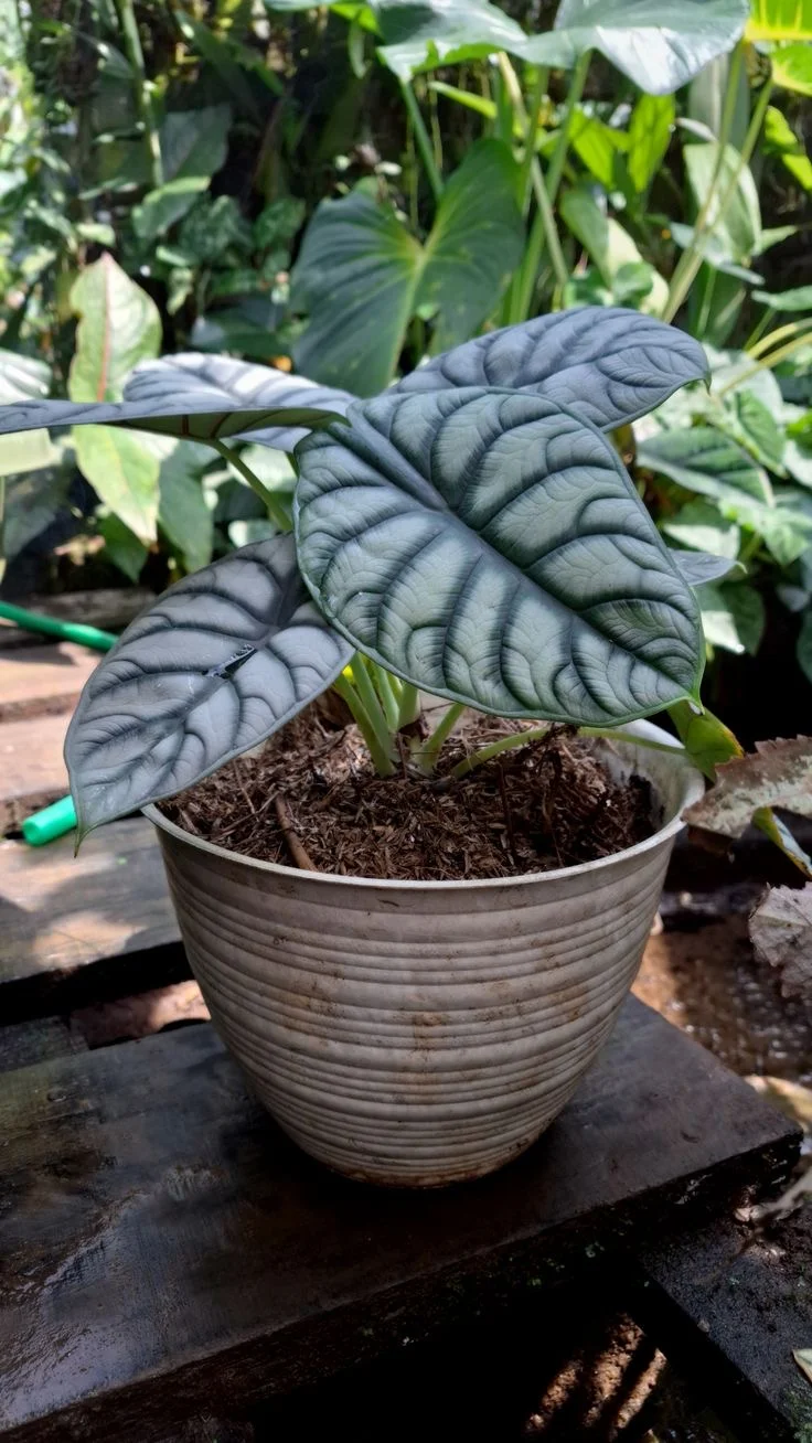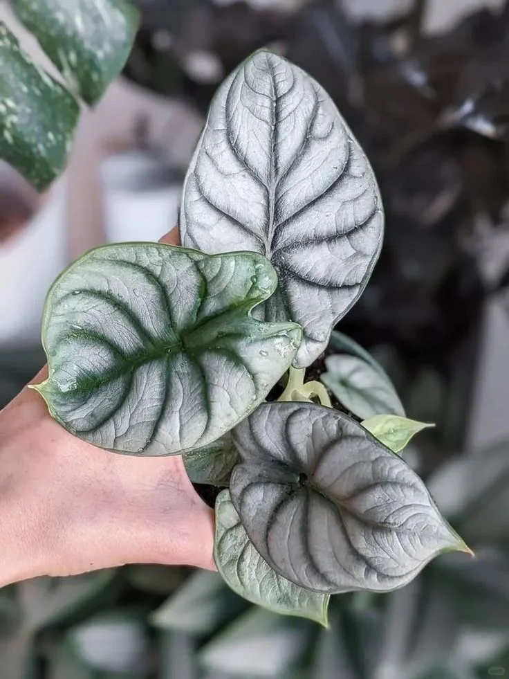 Alocasia baginda 'Silver Dragon'以其独特银白色叶片而闻名。叶片厚实,表面有着细腻的纹理,带有显著的银白色和深绿色脉络对比。 冬季白犀牛养护指南 浇水💦:冬季白犀牛生长缓慢,应减少浇水频率,若长期所处环境低于10度以下应停止浇水。 温度🌞:冬季应保持温暖,避免低于15度,防止受冻。 施肥🌱:冬季保持温暖,养护环境高于20度可正常施肥。若低于20度则应当停止施肥,避免产生肥害。
