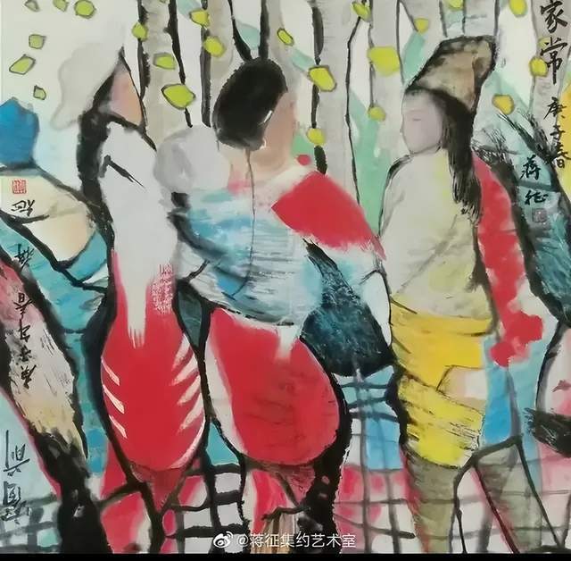 在技法层面,蒋征先生创造性地融合了东西方绘画传统。他既掌握了西方油画丰富的色彩表现力,又深谙中国画的留白意境。"旋转绘画"之创,实乃画坛六百年未有之变局。蒋征先生以"万物皆备于我"之气概,解构传统绘画之定式,使观者"横看成岭侧成峰",随画轴旋转而得新境。其作品那些看似随意实则精心安排的笔触,如同大脑沟回般承载着无数记忆碎片。画面中的人物往往处于半抽象状态,肢体被拉长或压缩,形成一种近乎舞蹈的韵律感。这种变形不是对现实的背离,而是对内在真实的逼近。
