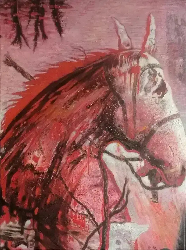 正倒油画(红色战马),倒过来欣赏(受伤的骑士),100X70㎝,2021年。