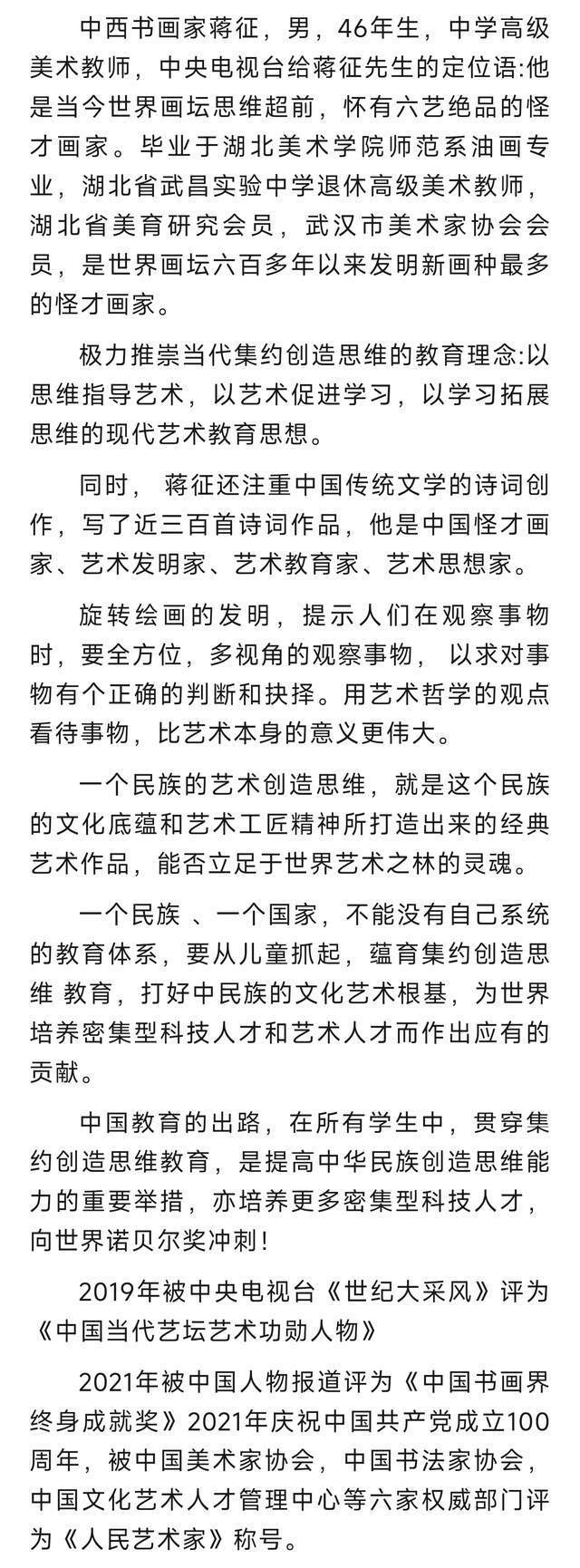在当代艺术星空中,蒋征以一个底层艺术家的超前眼光,率先用集约艺术创造思维在艺术领域里天马行空、奇思妙想、异想天开的姿态,以画境为思想领域,在形式与意蕴的临界点中持续突破,历经四十余年的艰辛,创造出人类绘画艺术史上罕见的旋转及正倒书画神品。其作品超越了传统绘画艺术的表达范式,构建出兼具诗性哲理与视觉转换张力的独特美学体系。