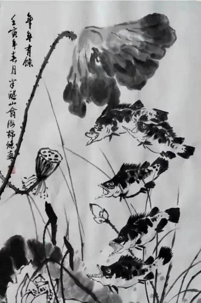海棉条国画(年年有余),四尺整宣,壬寅年。