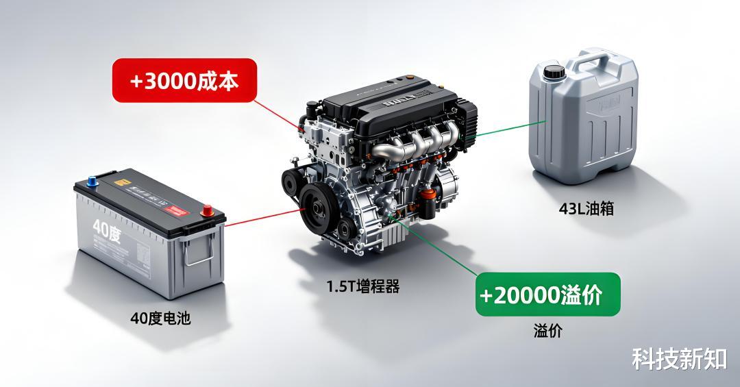 当动力电池均价两年暴跌四成,当公共充电桩的城市覆盖密度从每平方公里1.7个提升至2.43个增幅达43%,足以支撑起这场“伪纯电”体验的革命。车企们心照不宣地算清了一笔账:40度电池搭配1.5T小排量增程器再加43L油箱的组合,成本仅上浮三千元,却能在终端市场收割两万元的溢价空间。