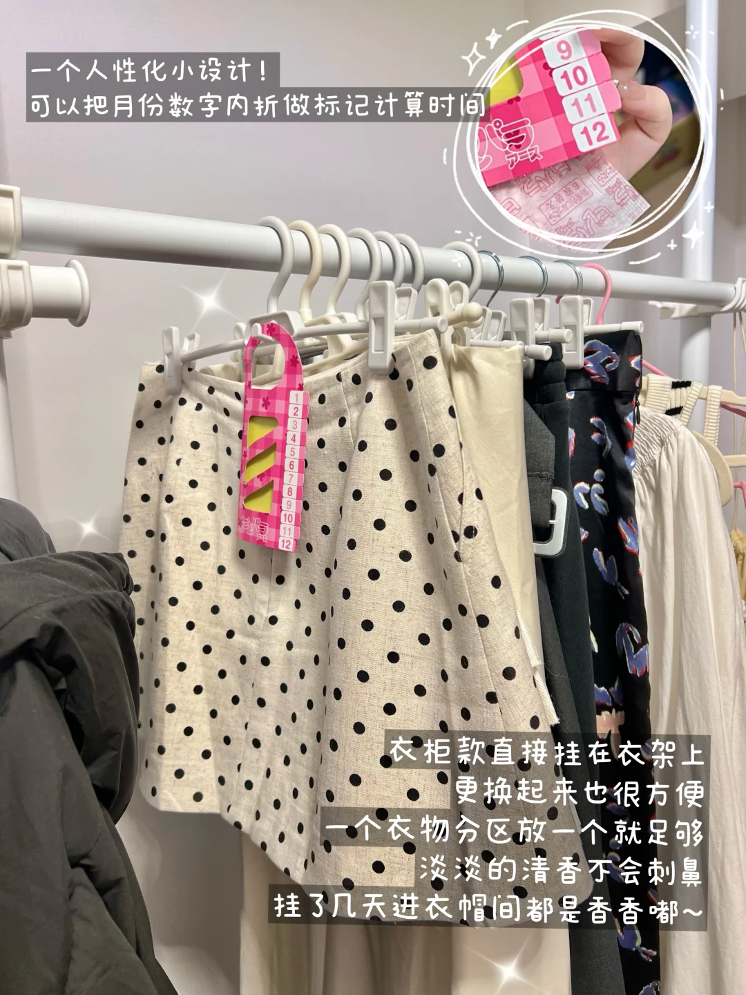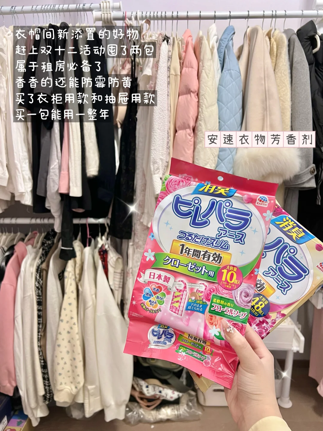 哈咯大家👋 又到了双十二买买买的阶段 这次挖到了只需几十块钱就能用一年的居家好物! 马上来和大家分享啦~ - 一到秋冬房间就湿湿的不干爽 非常容易滋生霉菌 挂在衣柜里的衣服也有一股让人不舒服的霉味🙃 趁双十二回购了安速衣物芳香剂 有挂式款和颗粒款两种~ 挂式款可以挂在衣柜里 还有数字标识帮忙记录时间 将月份数字向内折叠就行 明年的这个时候就可以替换啦!😊 颗粒款可以放在收纳盒、鞋柜里 粉色变成紫色后就可以更换啦~ 区别于过去常用的樟脑丸 没有添加农药和其他不好的成分 所以也很适用于有娃养宠的bb~♥ - 现在一进入房间就能淡淡的清新的花香 太好闻啦! 好用的居家好物确实能让人心情变好😌 有需求的集美可以趁双十二屯一波哦~
