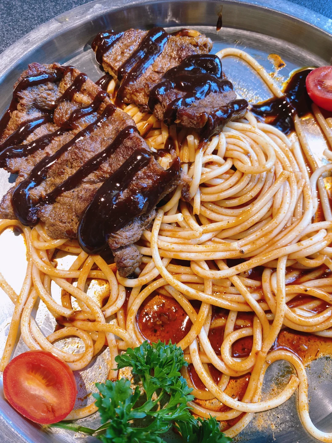 对于打工人来说,中午吃什么成了每天的必修课,不想吃炒菜不想吃火锅不想吃冒菜,还能吃什么?那必然是牛排🥩意面🍝啊。 没想到俊熙家烤肉🍖竟然推出了牛排🥩工作餐,而且这个牛排还是谷饲眼肉牛排🥩,完全没有筋,一口咬下去肉质很嫩,煎的也恰到好处,搭配上黑椒酱和意面,这一顿工作餐简直元气满满,最重要只要二十多块就可以拥有了。可以堂食也可以打包哦,简直是打工人午餐的最优选。