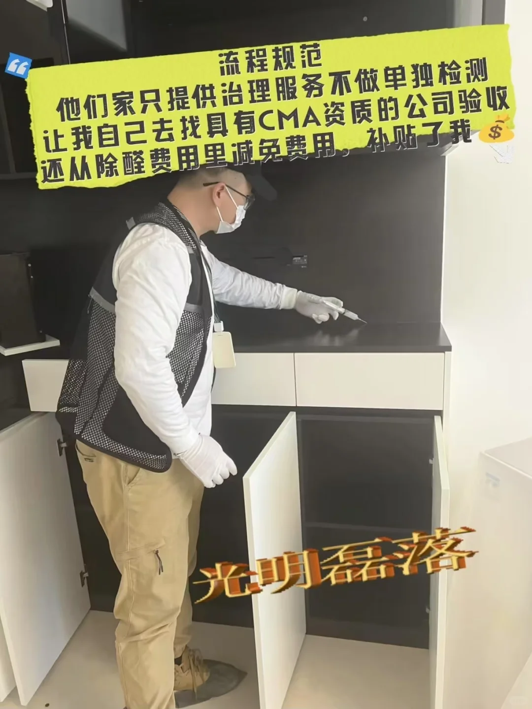 其次,流程规范。他家的整个流程我是很认可的。他家并不提供单独的甲醛检测服务,只提供甲醛治理,而且验收检测也是鼓励客户自己去找具有cma资质的第三方公司来检验。同时还没有机构或者时间限制。