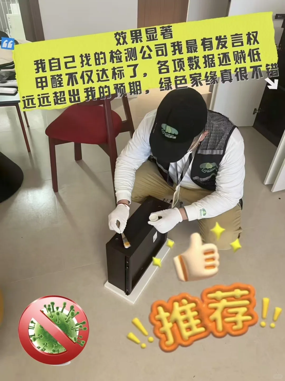 最后,效果显著。由于我是自己找的第三方cma机构来检测验收的。所以这点我还是很有发言权的。甲醛等各项数值不仅达标了,而且都处于非常低的数值了。远超出了我的预期,更关键的是这个结果确实是真实的。除此之外,他家的服务也确实很到位,体验很好,很负责任。所以绿色家缘这个品牌我很推荐🎉🎉
