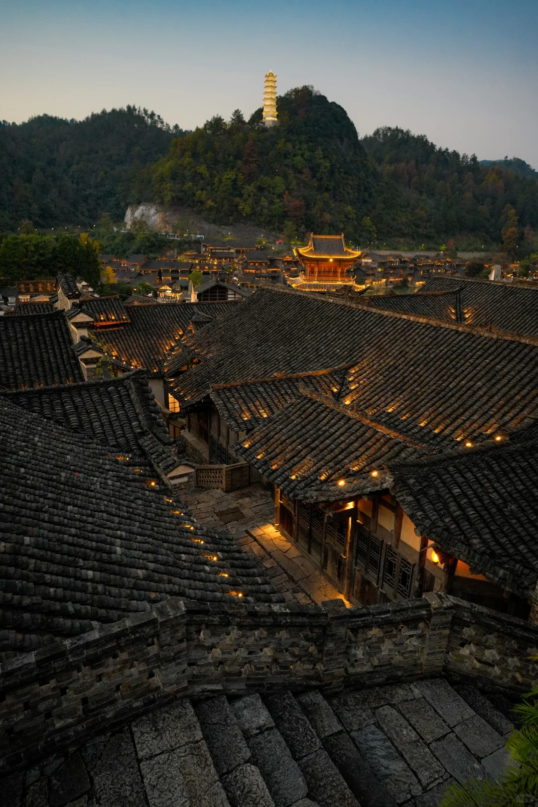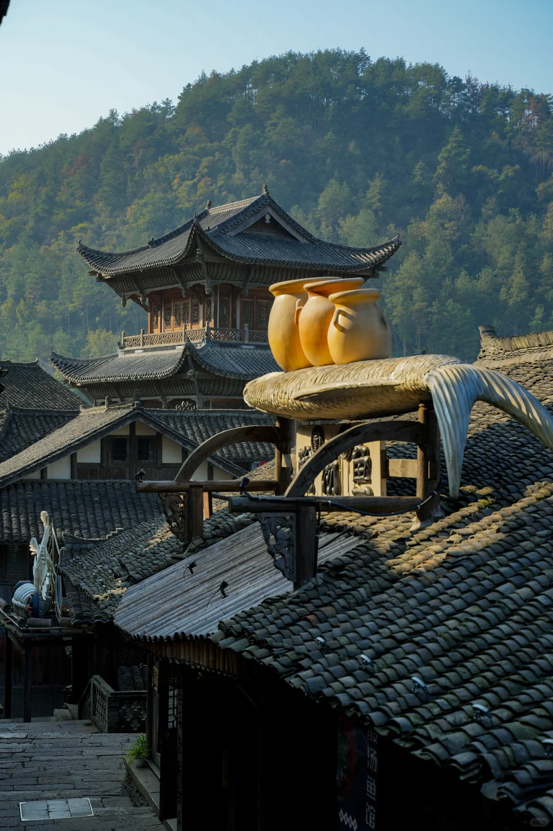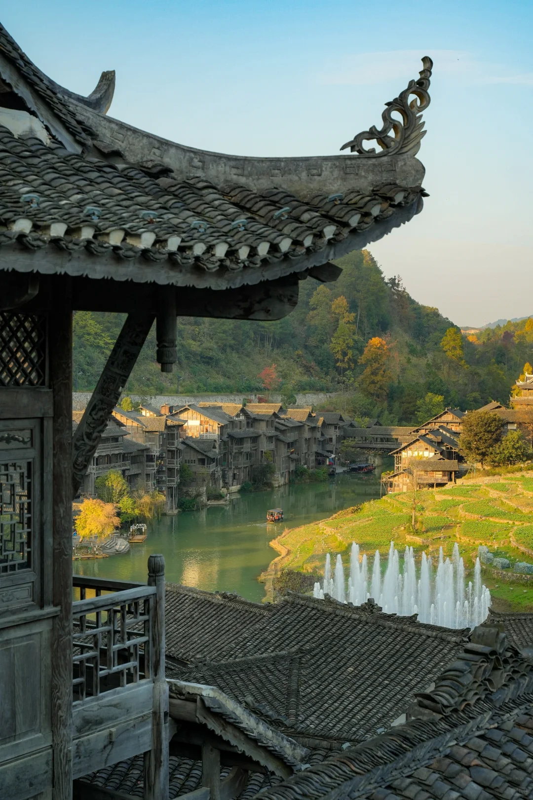 半山机位一览乌江寨,可以坐在房梁上拍照