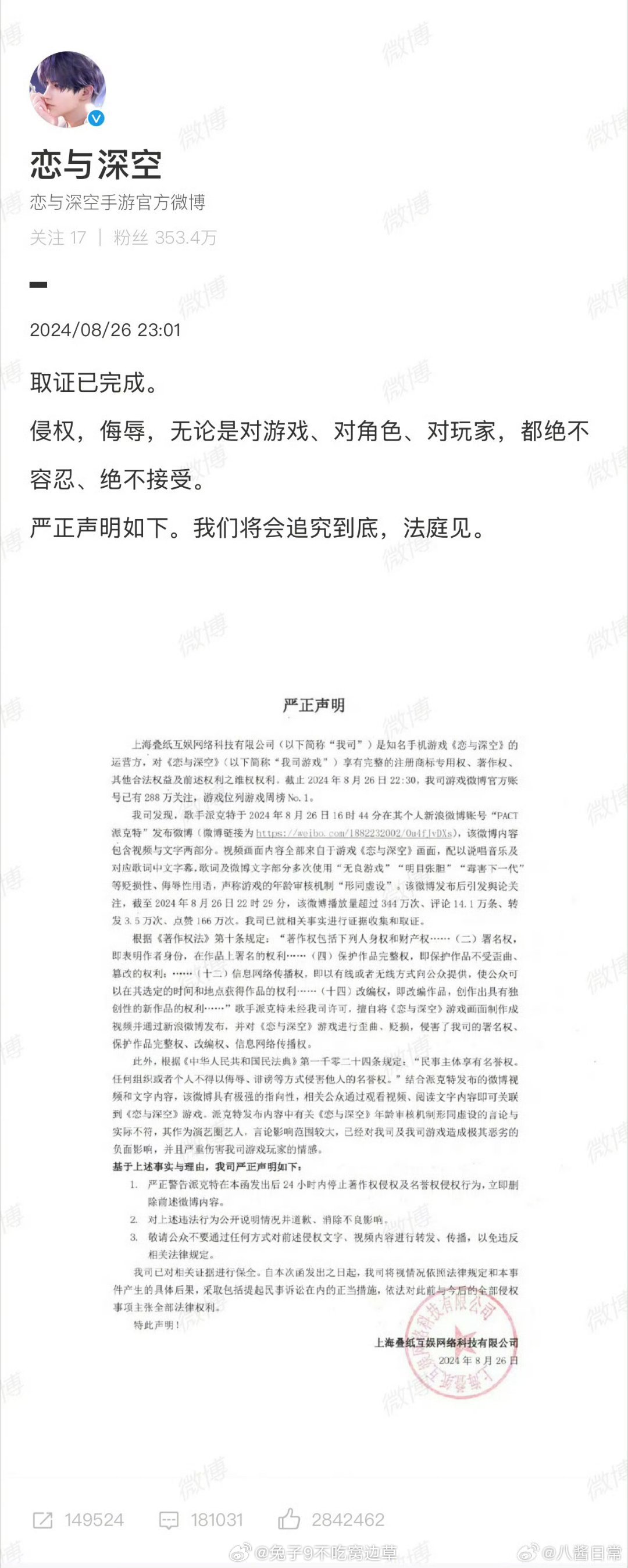 都醒醒,狗叠法务部干活了![送花花]之前派克特发歌diss乙游,让乙圈大联合[送花花]最近据企查查显示,叠纸起诉派克特(原名王昆)名誉权纠纷案件将于2025年1月14日开庭!!!爽[挤眼][挤眼][挤眼]