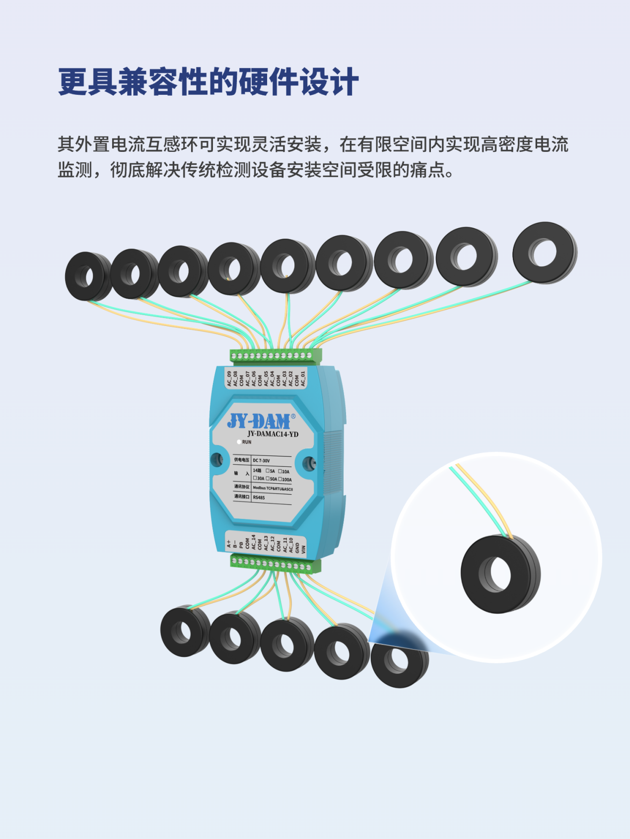 JYDAM-AC14-YD是一款工业级多通道交流电流检测模块,采用便捷的导轨安装设计,专为配电柜智能化升级设计。