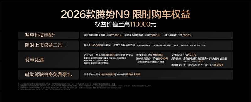 为回馈广大用户的支持与信赖,2026款腾势N9特别推出限时购车权益:10月31日(含)前提车的用户,全系可享10000元保险补贴或金融贴息(二选一),置换补贴至高10000元。此外,还有价值45000元的智享科技,以及辅助驾驶终身免费豪礼。根据不同款型,限时赠送极致性能套装、电动侧踏板、隐私声盾等科技豪华配置。智能电动门、吸顶屏套装、流媒体外后视镜以及双色车身均享限时选装价格,让豪华触手可及。详情敬请咨询腾势直营店及当地经销商。