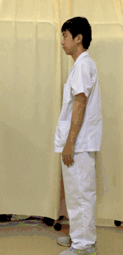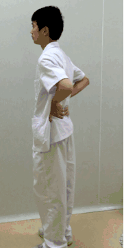 a、两脚分开站直,双手放在后腰部,四指靠在脊椎两侧。