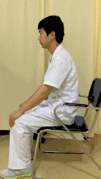 a、坐在椅子的边缘。双腿尽量分开。双手平放在腿上。