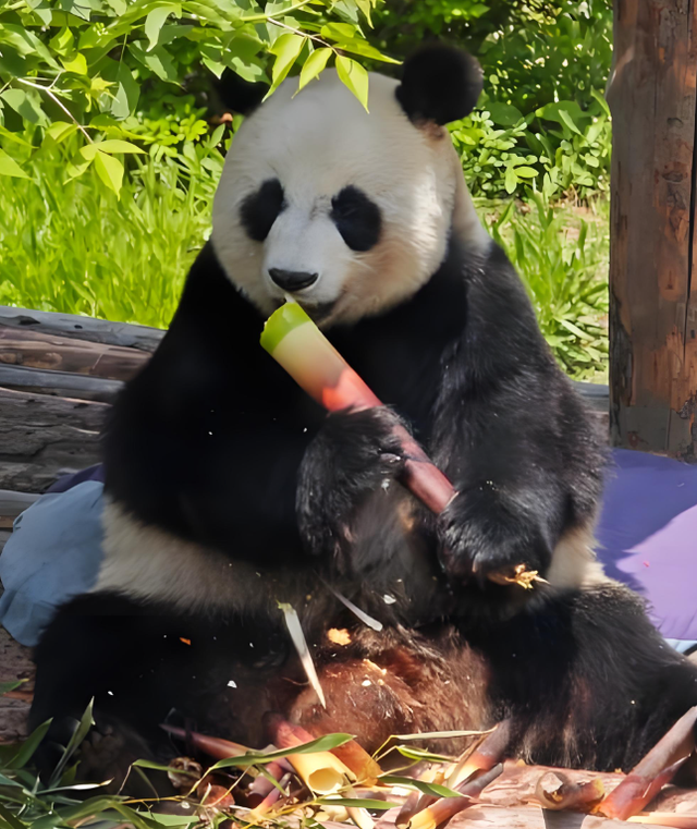 福宝的胖,全是“宠”出来的,姜爷爷和宋爷爷每天变着花样给它做辅食,苹果、胡萝卜、窝窝头,甚至还会把钙片藏在苹果里投喂,让它想不胖都难。它干饭主打一个“豪放”,躺吃竹竿、坐饭桌啃笋,竹笋皮堆满肚皮都是常事,吃竹子太过用力,差点把自己拉成双眼皮,小眼睛眯成一条缝,却依旧舍不得放下竹子。偶尔还会因为太胖,压裂树包保护膜,被戏称“破坏公物”,胖得可爱又霸气,妥妥的“熊界小富婆”。