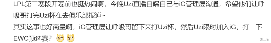 Uzi虽然想留人,但俱乐部那边不可能为了一个杯赛放人。网友调侃:“iG管理层让呼吸哥留下来打Uzi杯,然后Uzi限时加入iG,打一下EWC预选赛?”