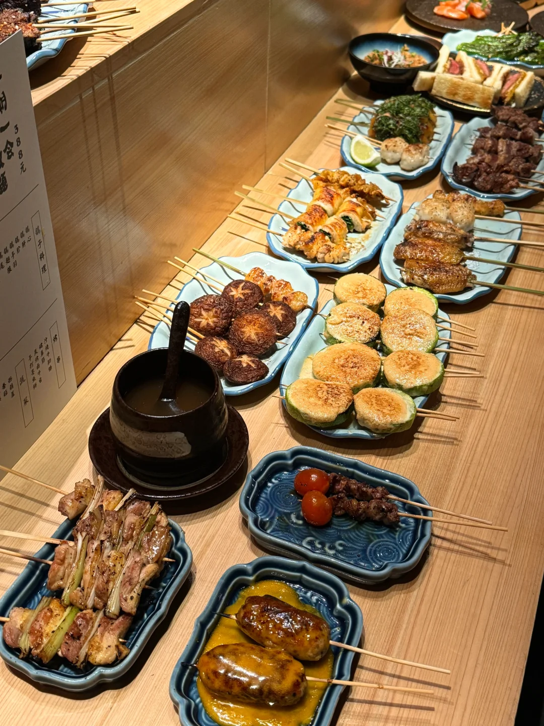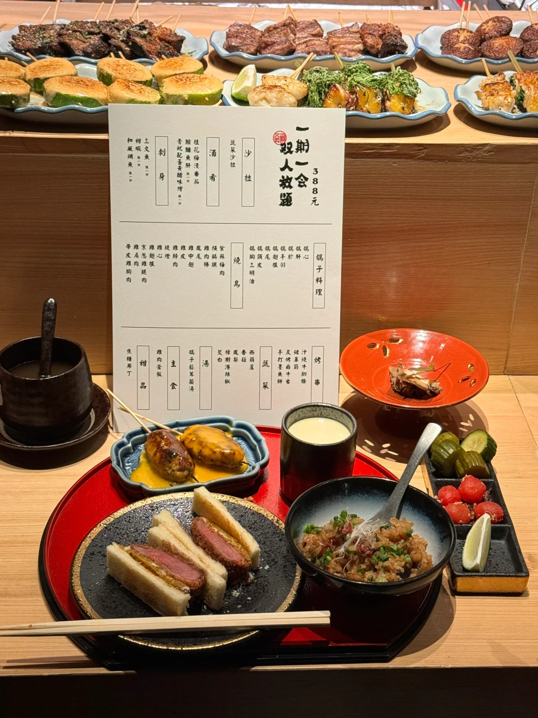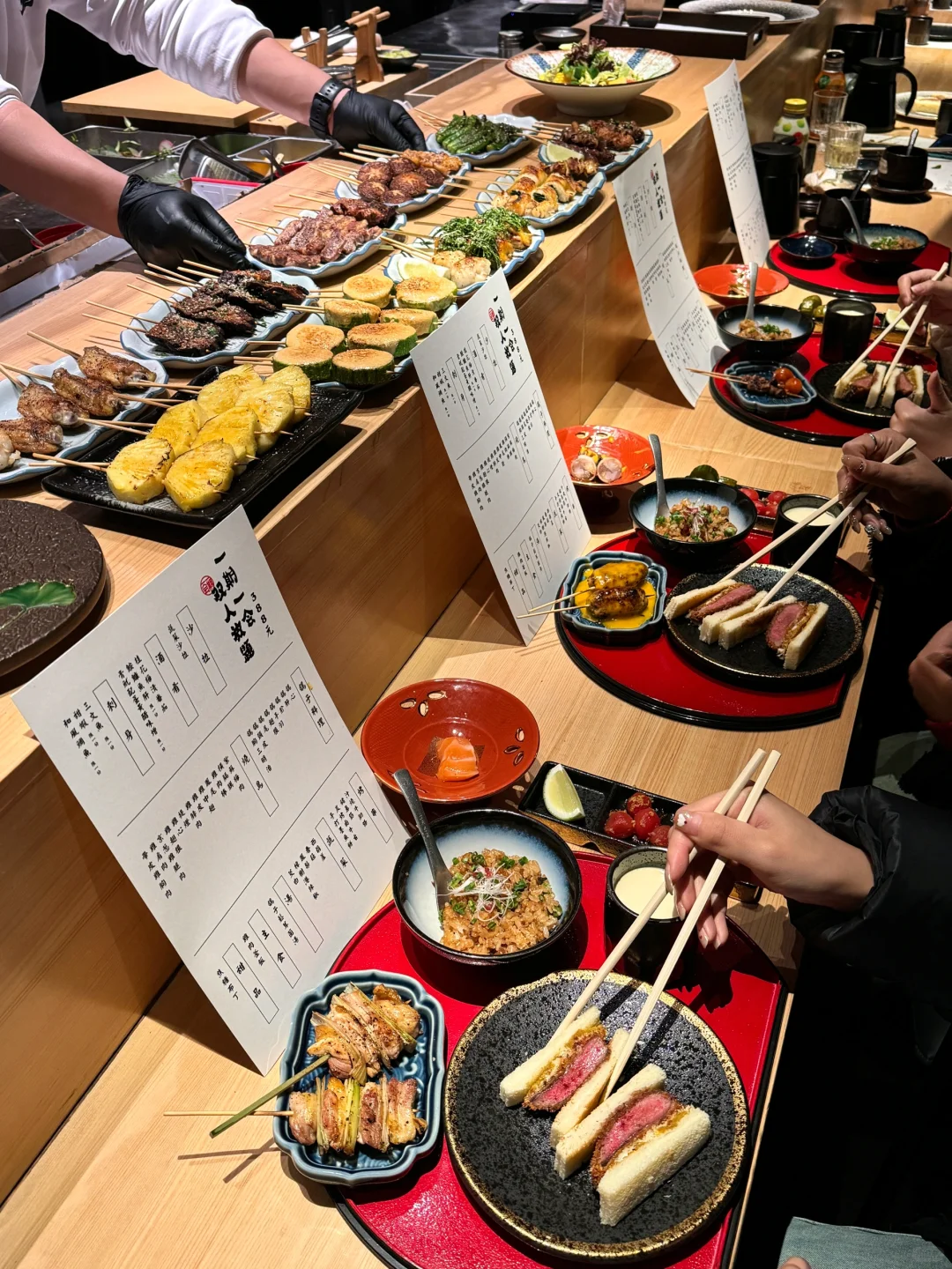 出现了!!😭😭分分钟能吃回本的放题!! 三文鱼甜虾🍣刺身、鸽胸三明治🥪、不同部位的烧鸟🍢、主食🫕……都是随便吃的,品质也都好好🤤直接吃爽了!!