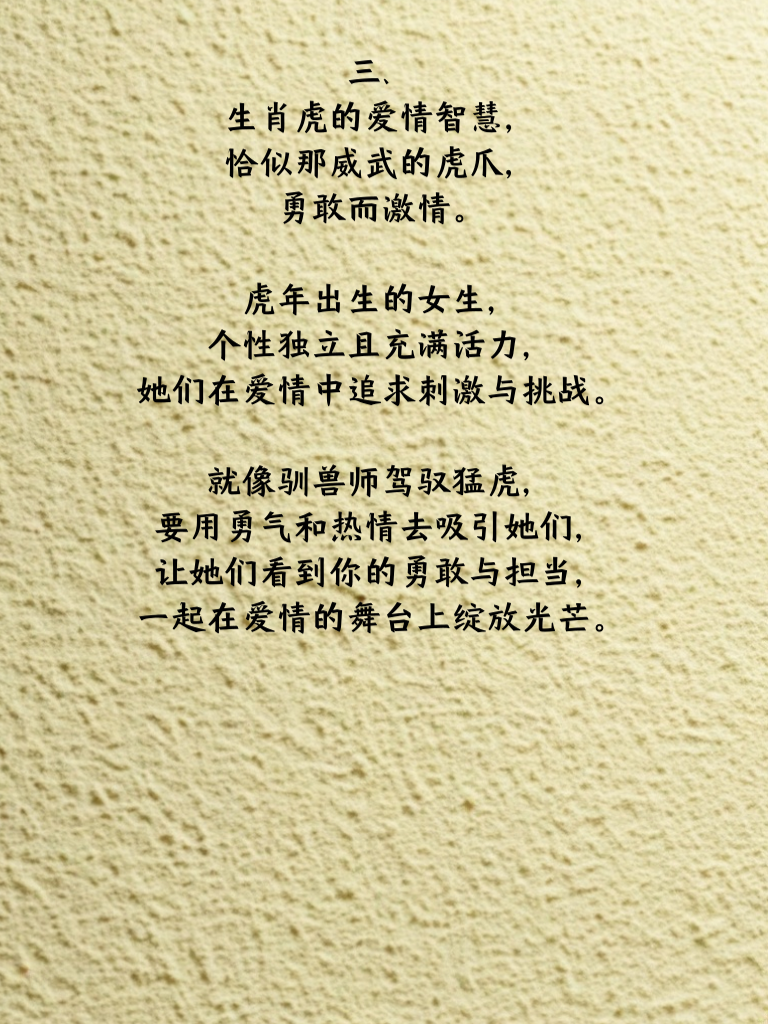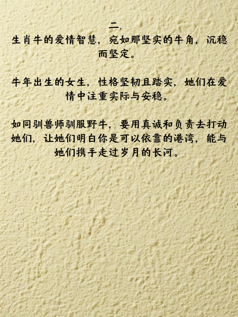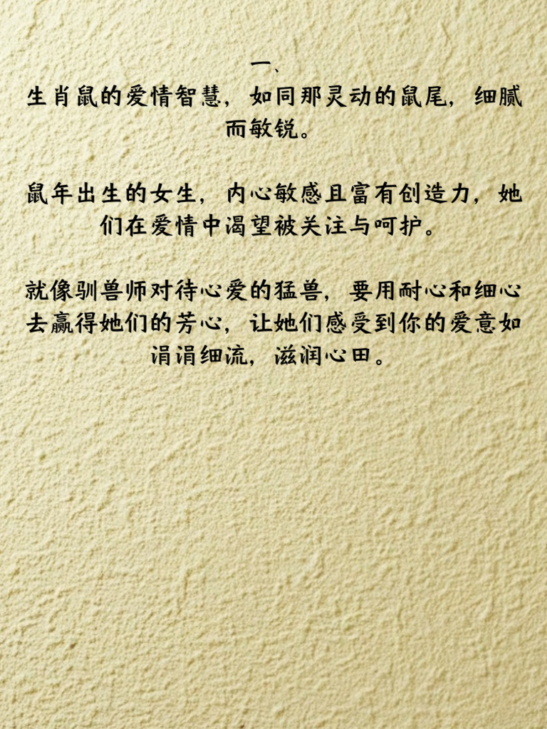 一、生肖鼠的爱情智慧,如同那灵动的鼠尾,细腻而敏锐。鼠年出生的女生,内心敏感且富有创造力,她们在爱情中渴望被关注与呵护。就像驯兽师对待心爱的猛兽,要用耐心和细心去赢得她们的芳心,让她们感受到你的爱意如涓涓细流,滋润心田。 二、生肖牛的爱情智慧,宛如那坚实的牛角,沉稳而坚定。牛年出生的女生,性格坚韧且踏实,她们在爱情中注重实际与安稳。如同驯兽师驯服野牛,要用真诚和负责去打动她们,让她们明白你是可以依靠的港湾,能与她们携手走过岁月的长河。 三、生肖虎的爱情智慧,恰似那威武的虎爪,勇敢而激情。虎年出生的女生,个性独立且充满活力,她们在爱情中追求刺激与挑战。就像驯兽师驾驭猛虎,要用勇气和热情去吸引她们,让她们看到你的勇敢与担当,一起在爱情的舞台上绽放光芒。