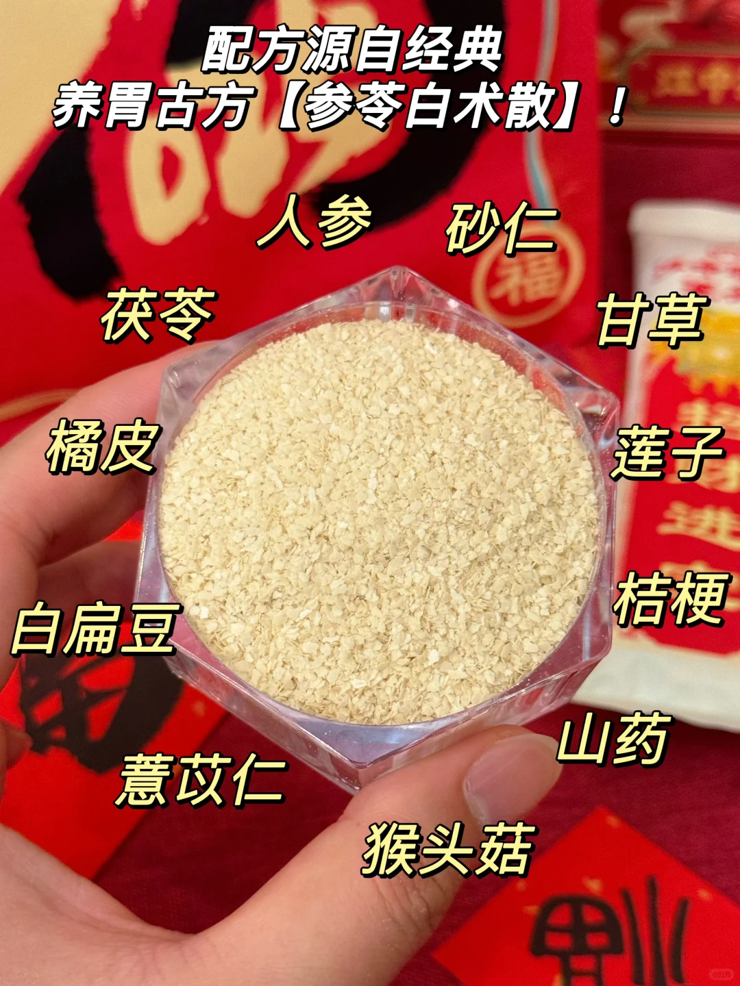 配料:人参、茯苓、 猴头菇、白扁豆、甘草、薏苡仁、橘皮、莲子、桔梗、 山药、砂仁