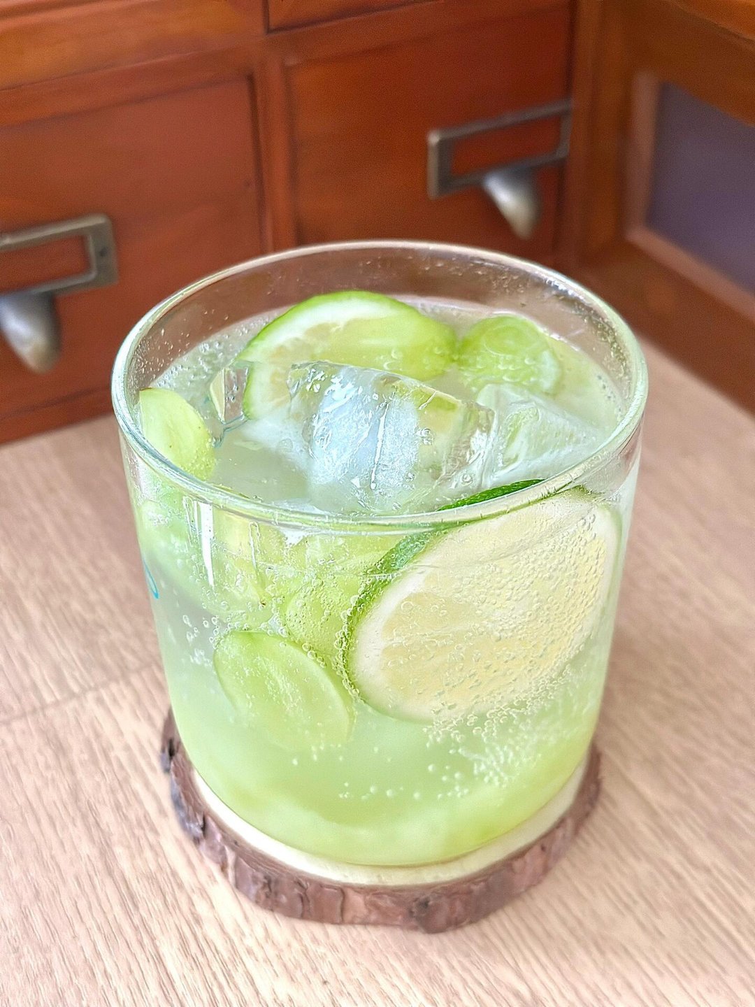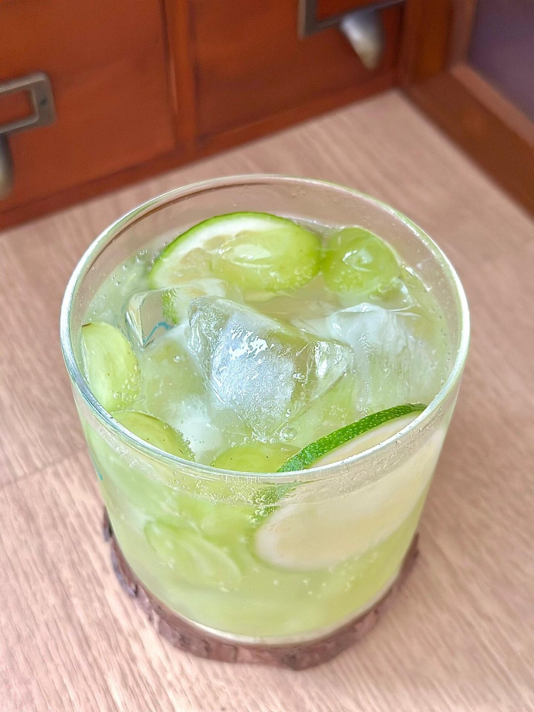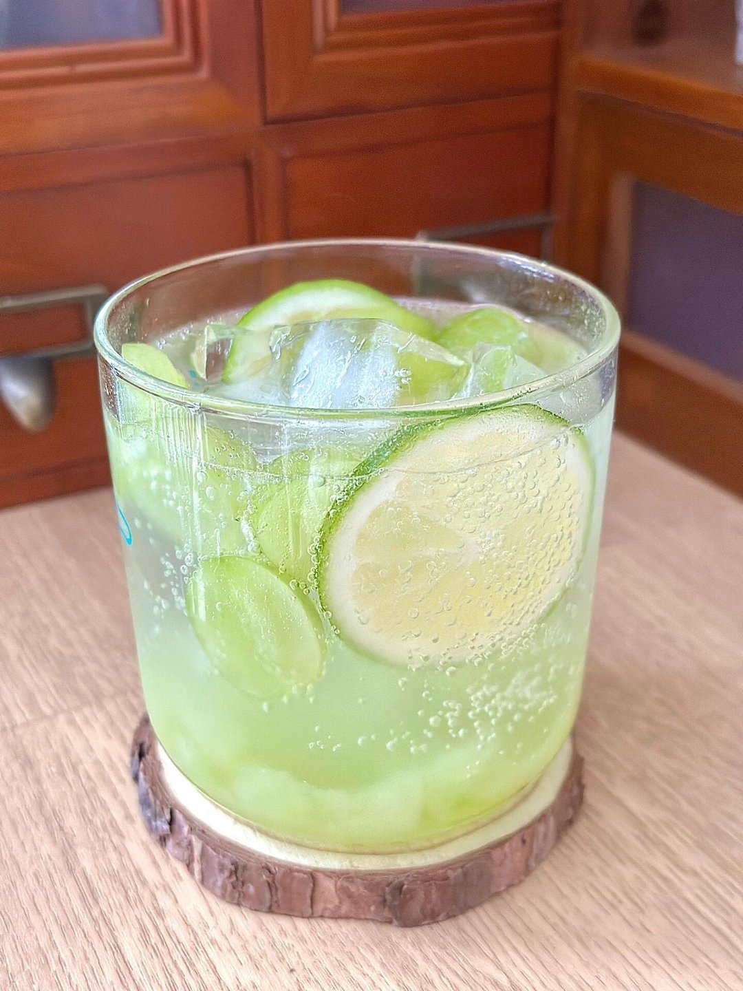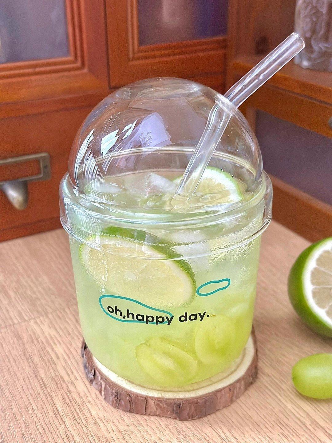 5. 最后,将剩余的青提串起来放在杯口作为装饰,一杯青提柠檬气泡水就完成了。