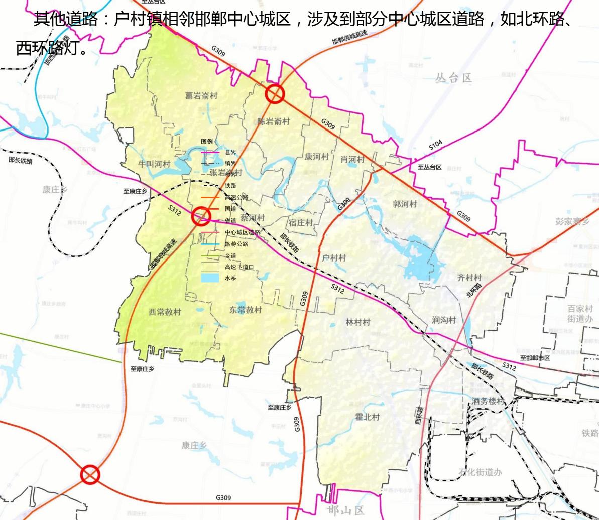 户村镇构建综合交通体系以邯郸绕城高速、G309、S312为骨架,建立快速便捷的镇域交通体系。铁路:邯长铁路东西向穿镇而过,并在镇域东部设有邯钢站,加强户村镇对外的联系。高速公路:邯郸绕城高速与镇域西部南北向穿镇而过,并设有2处高速下道口,交通便利。国道:G309是户村镇南北向主要对外联系道路,连接丛台区与康庄乡。省道:S312(邯武快速路),是武安市与邯郸市区联系的主要道路。东西向穿镇而过。其他道路:户村镇相邻邯郸中心城区,涉及到部分中心城区道路,如北环路、西环路灯。