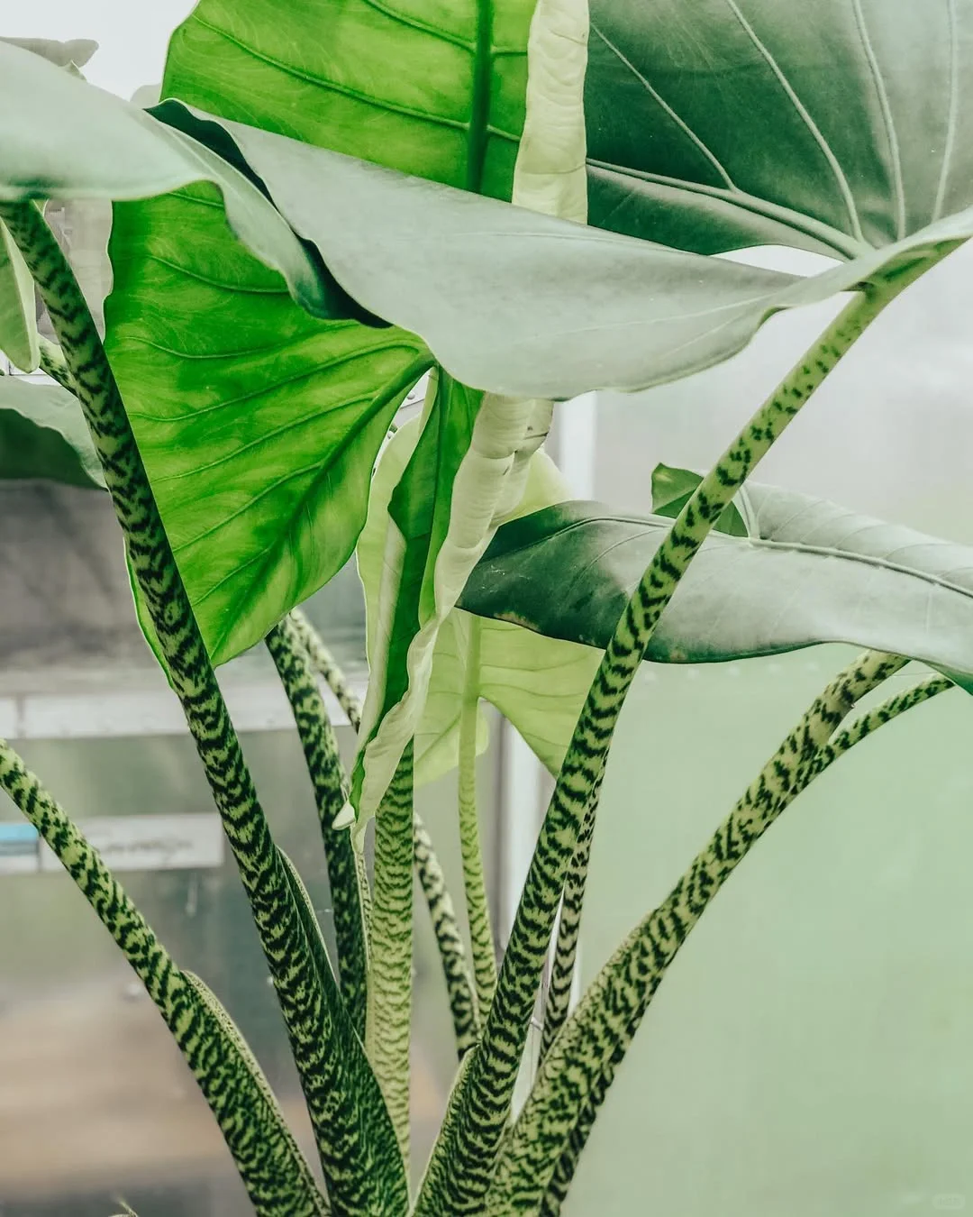 斑马海芋辨识度极高,叶片是其魅力所在。叶片宽大,呈长椭圆形。叶片主色调为深绿色,表面有显著白色或淡黄色叶脉,如斑马条纹平行分布,因此得名。其叶片边缘微微卷曲,增添几分俏皮。