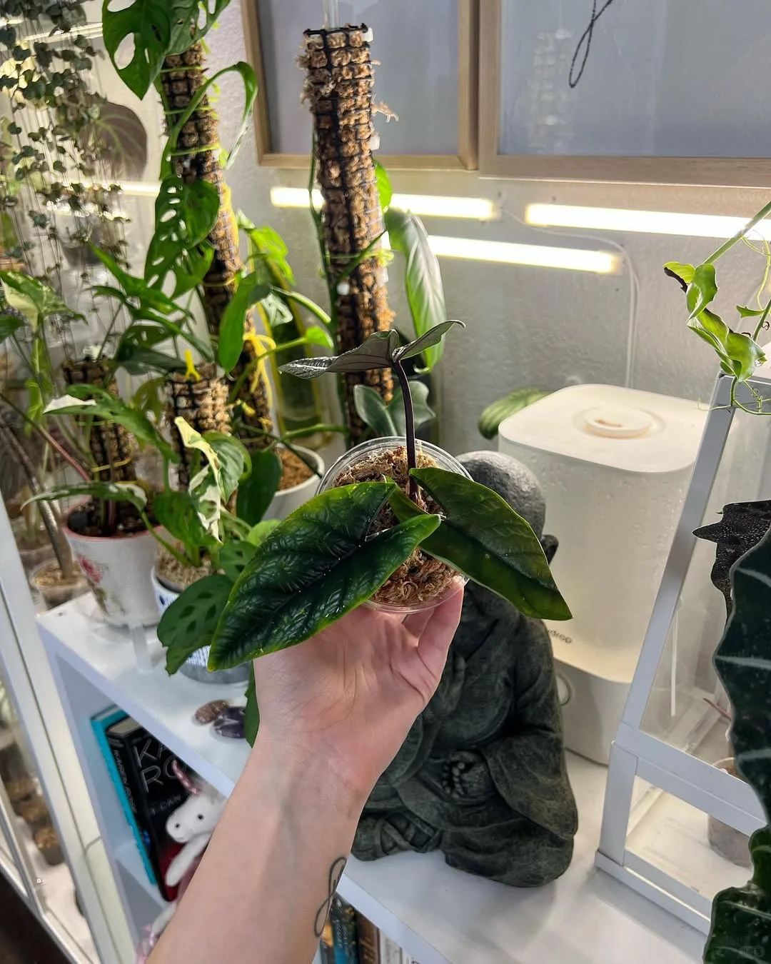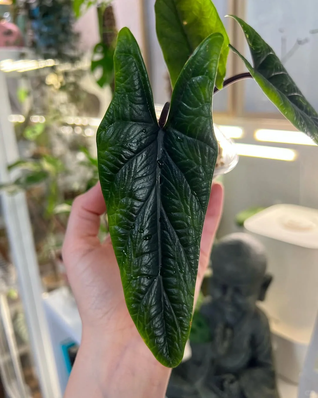 板盾海芋(Alocasia plumbea),天南星科海芋属的多年生草本植物,原产于菲律宾的热带雨林。 它的植株高大,叶片巨大且呈盾状,这独特的形态使其在植物世界中辨识度极高。叶片表面光滑,色泽浓郁饱满,从翠绿到墨绿渐变,富有光泽。 板盾海芋喜温暖湿润和半阴的环境,对光照需求不高,适合室内散光养护。它生长迅速,对水分要求较高,需保持土壤湿润,但要避免积水导致烂根。在土壤选择上,宜用疏松肥沃、排水良好的微酸性土壤。