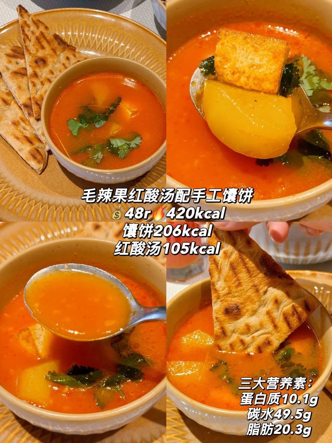 ☑️毛辣果红酸汤配手工馕饼手工酸面团制馕饼,在门店现烤的,焦香有嚼劲,里面有,豆腐土豆还有银芽菜,蘸着汤吃,口感丰富,好特别!