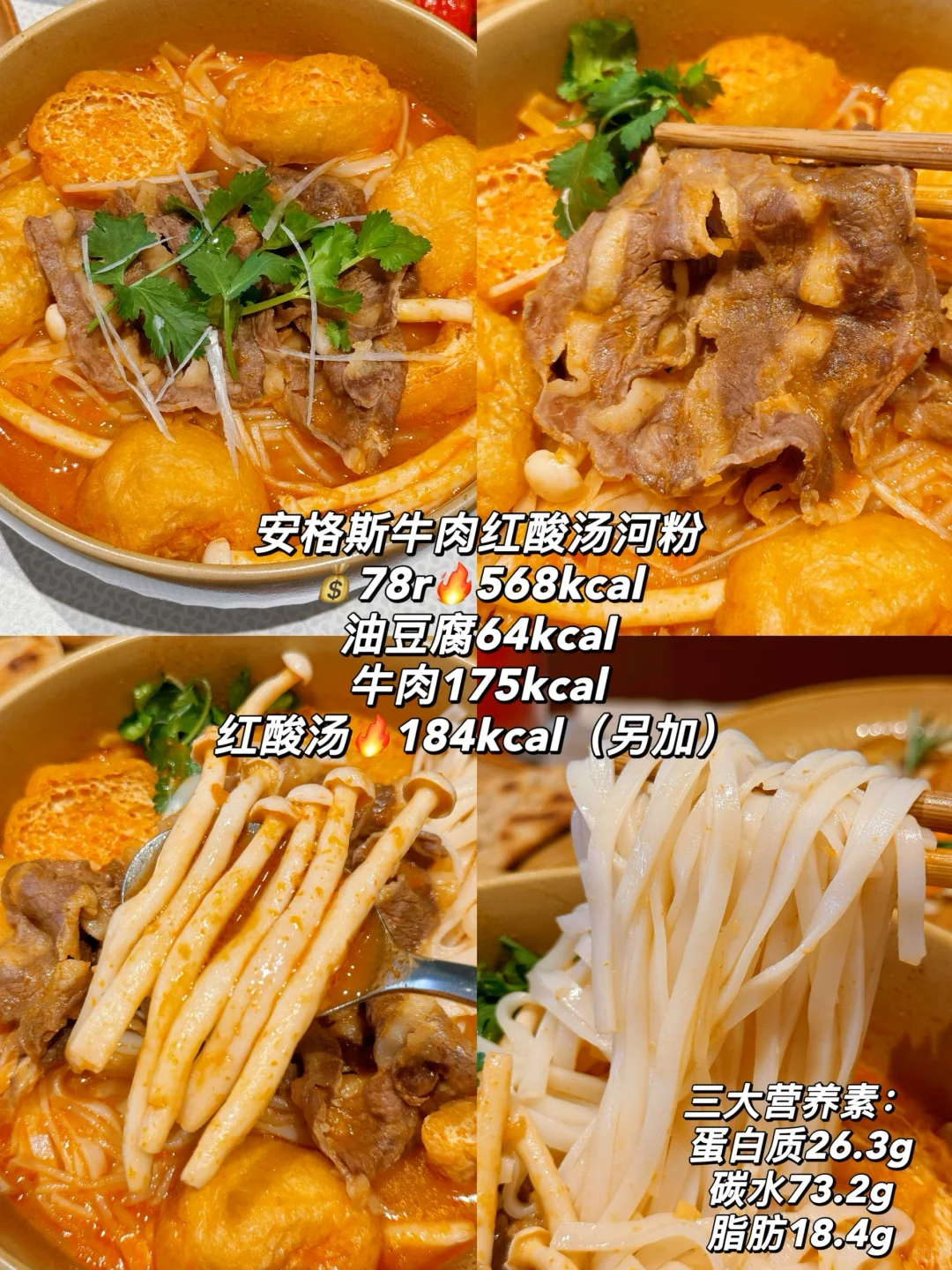 ☑️安格斯牛肉红酸汤河粉灵魂红酸汤搭配了浓浓的木姜子油,用的辣椒、毛辣果还都是贵州当地的,那叫一个好吃,配上油豆腐和菌菇。牛肉用的是谷饲安格斯牛肉片,肉质很嫩,软乎乎还超多汁。吃一大口河粉,再喝口热乎酸汤,全身都舒坦,绝绝子!