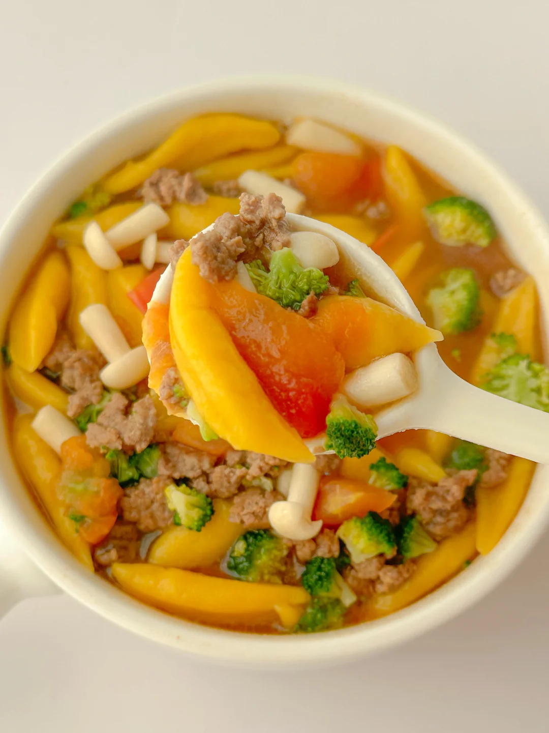 都给小朋友安排西兰花牛肉剪刀面,有肉有菜搭配均衡,酸甜好吃!南瓜香甜软糯,融入面中,让每一口剪刀面都带着自然的甜香,真的太好吃啦!