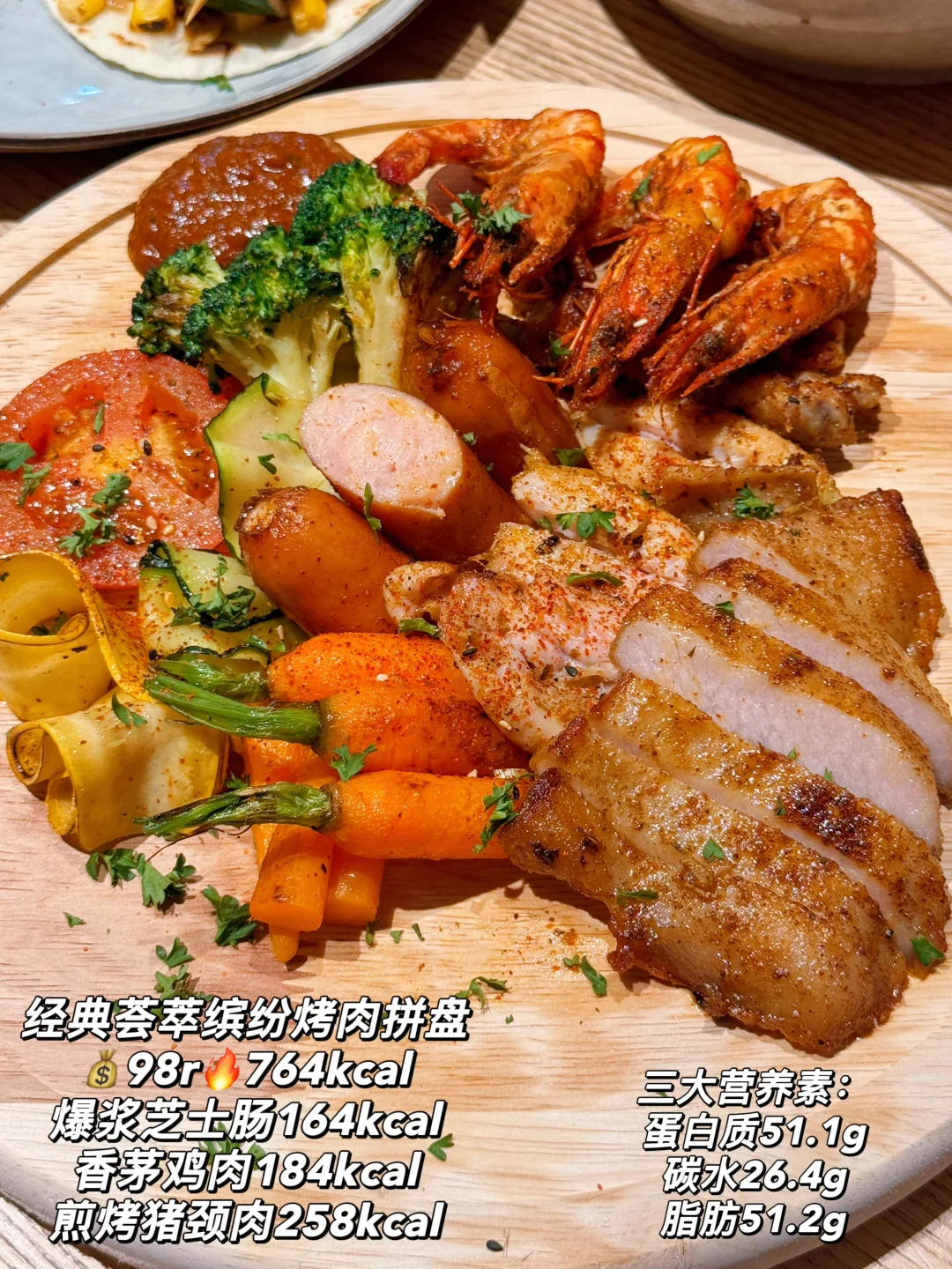 4种优质蛋白,猪颈肉、鸡腿肉、香肠还有越南黑虎虾,妥妥的肉肉拼盘!还搭配了酸甜的手工黄皮酱,这个一定要试试!