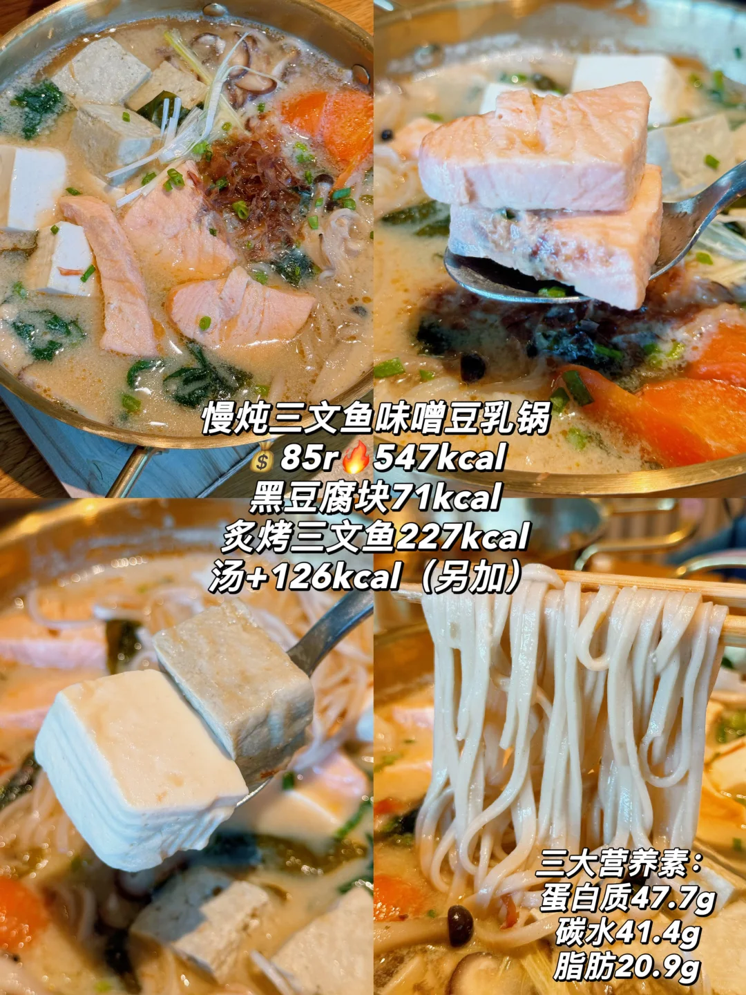 昆布柴鱼汤底熬足6小时,搭配豆乳和味噌,喝起来豆香很很浓郁可是又不会腻!两种不同口感的豆腐加上细嫩的三文鱼,蛋白质爆棚,太香了~