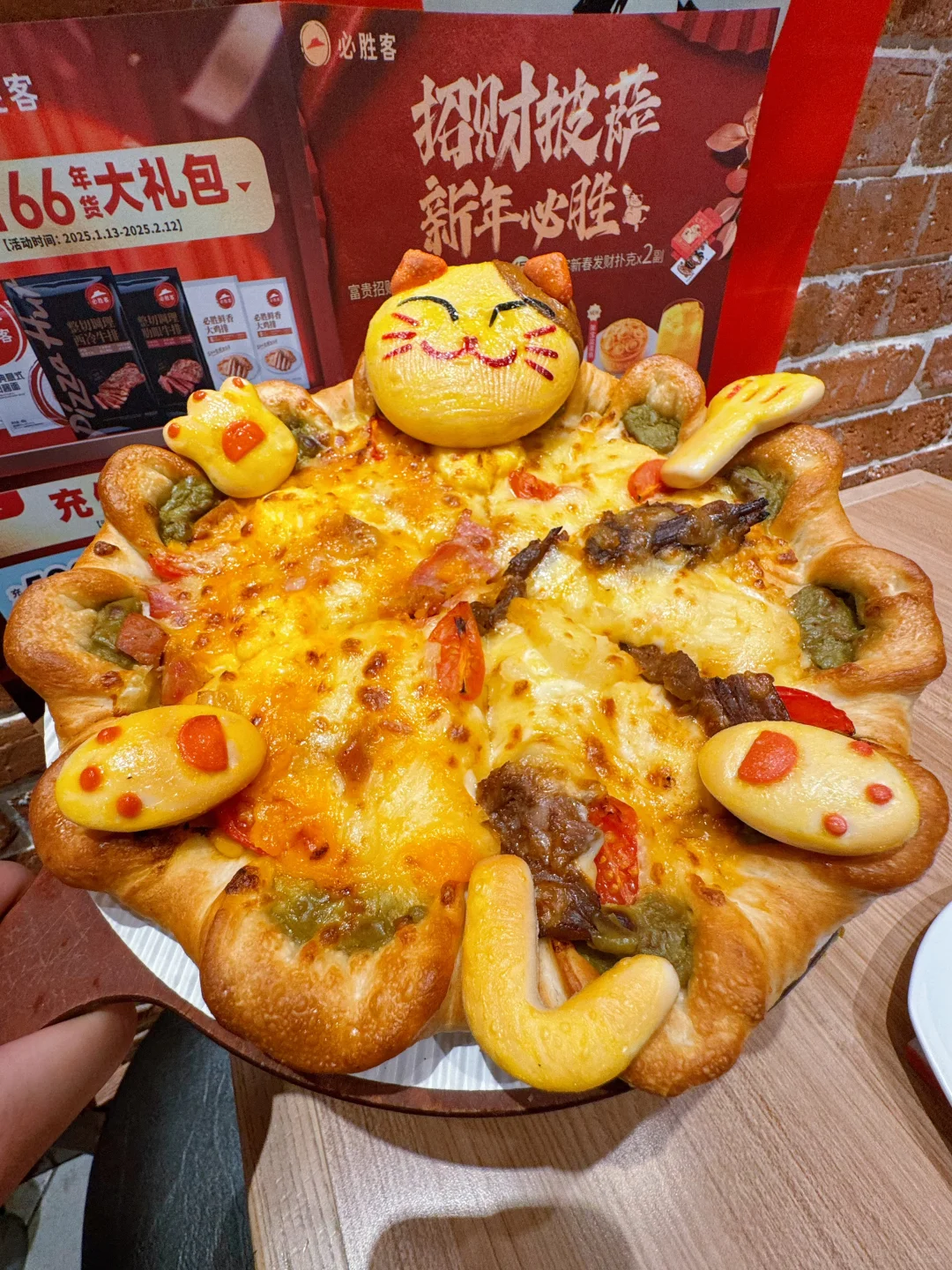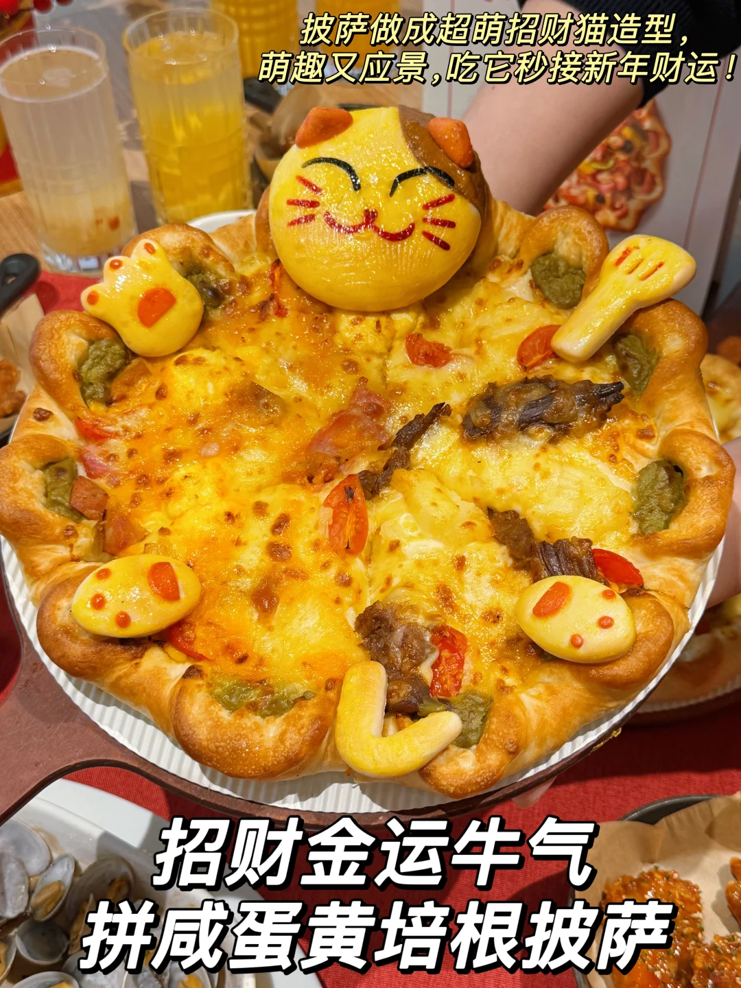 披萨做成超萌招财猫造型,萌趣又应景,吃它秒接新年财运 。
