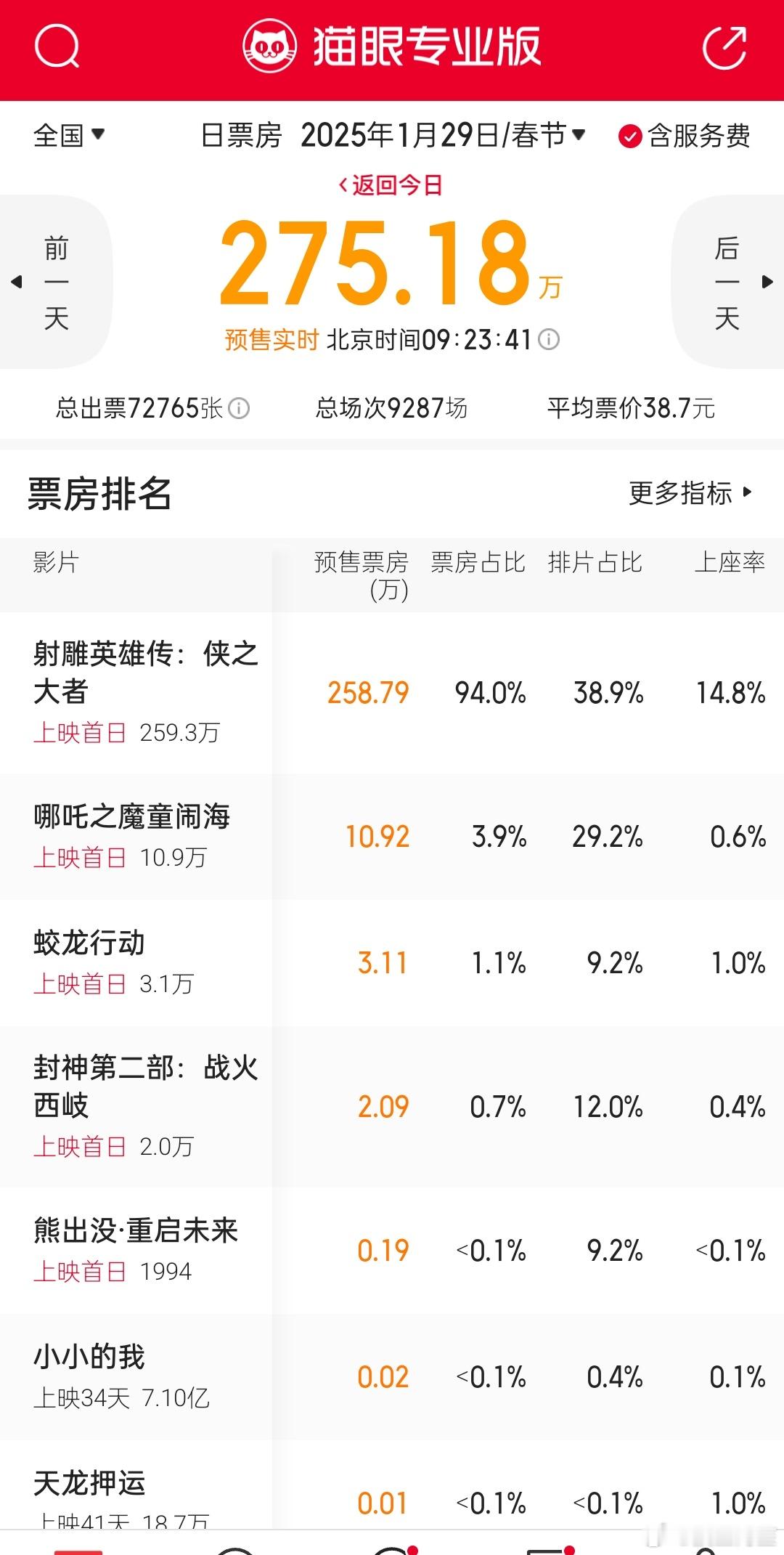 春节档预售票房榜出来了,因为影院要在9点以后慢慢去排片,所以现在都比较少