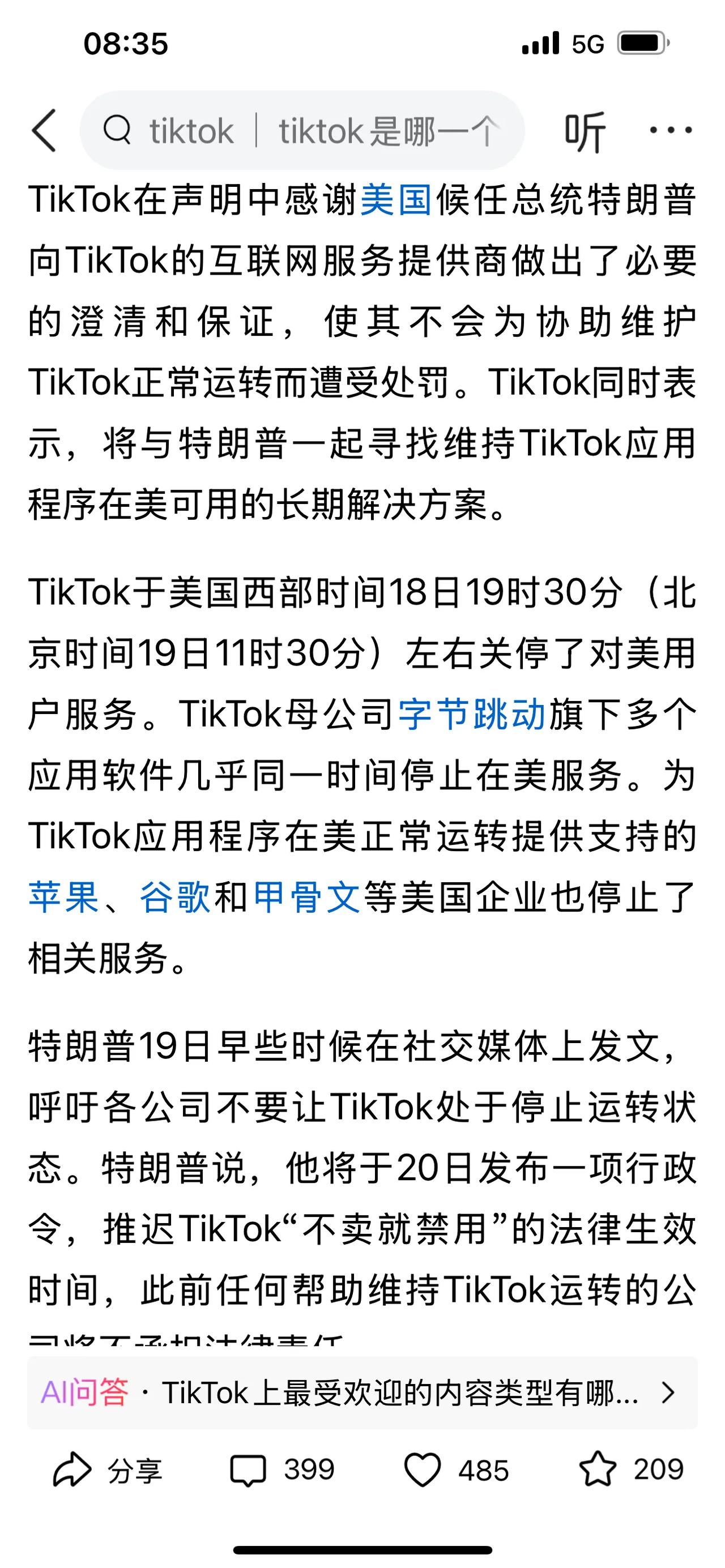 在美国最高法院认定针对TikTok的禁令不违宪后,TikTok昨天停止运营。今天