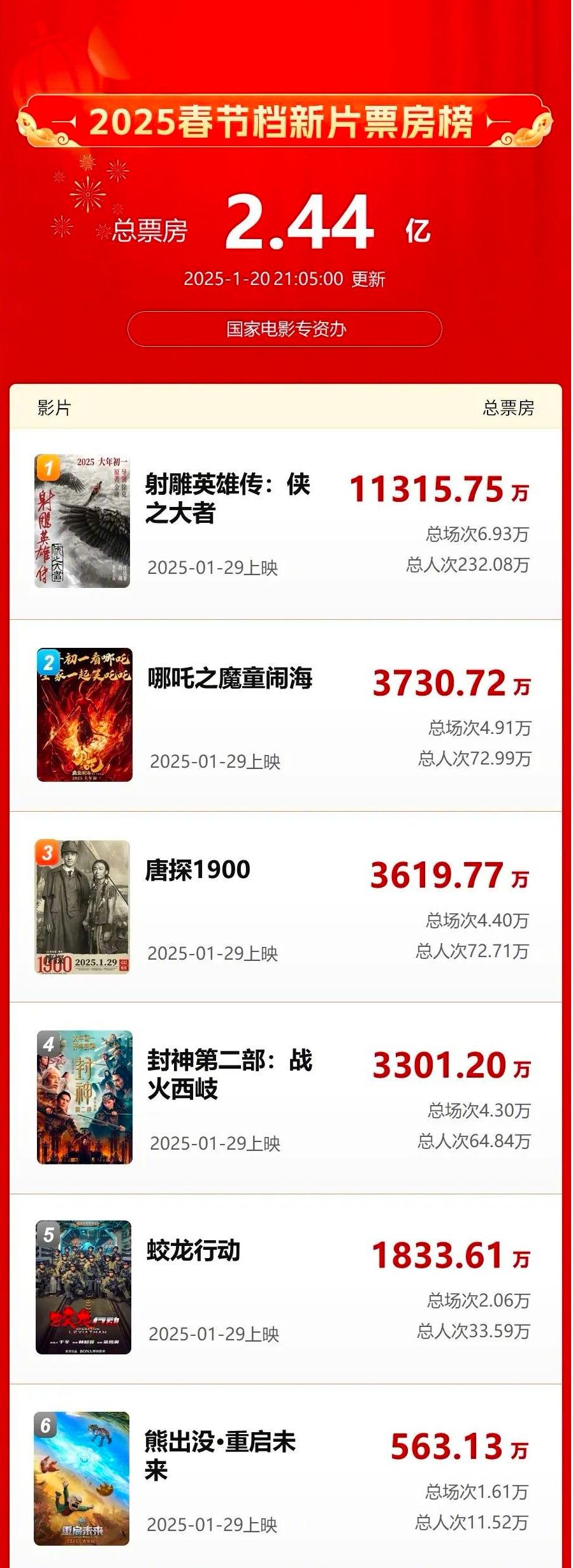 如今,根据“国家电影专资办”官方的票房预售成绩来看,截止到晚上21点,总票房约为2.44亿,其中,《射雕英雄传:侠之大者》一骑绝尘以1.13亿遥遥领先。 接下来《哪吒之魔童闹海》为3731万 《唐探1900》为3620万 《封神2》为3301万,由于第二梯队这三部预售成绩并未拉开差距,竞争可谓是相当激烈。 紧接着是《蛟龙行动》为1834万,《熊出没:重启未来》暂时垫底为563万。 虽然整体有很明显的差距,但是,等到正式上映的时候,还是有很多电影可以通过口碑逆转,当中,你最看好哪一部电影呢?