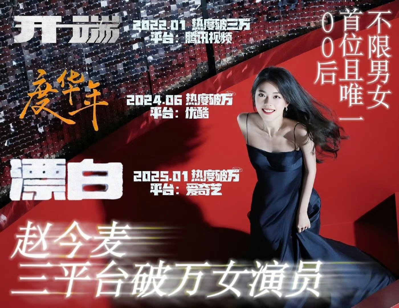 赵今麦首位00后三平台破万女演员 赵今麦凭借其主演的作品《开端》、《度华年》和《漂白》,成功实现了在三大平台的关注度均突破一万大关的目标。其中,《开端》于2022年播出,《度华年》在2024年上线,而《漂白》则在2025年初取得了巨大的关注。成功打破了三百万播放量的大关,成为首位达成此成就的00后女演员。是继赵丽颖、虞书欣后第三位三平台热度破万的演员。2025年开年,第一部大爆剧。