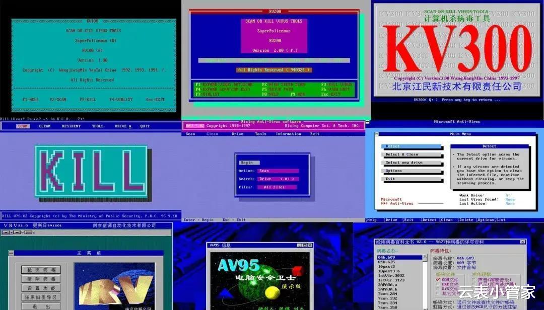 杀毒软件:江民KV、瑞星(装它的时候软驱咔咔响,那是在加密)、KILL、微软Anti-Virus。还有个经纬杀毒,能演示几千种病毒发作的样子。