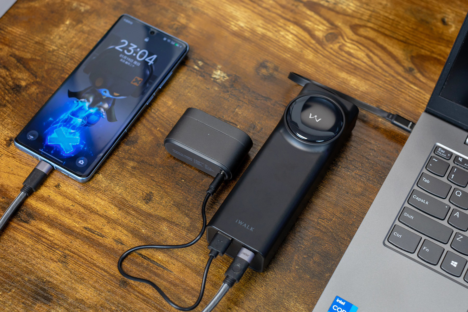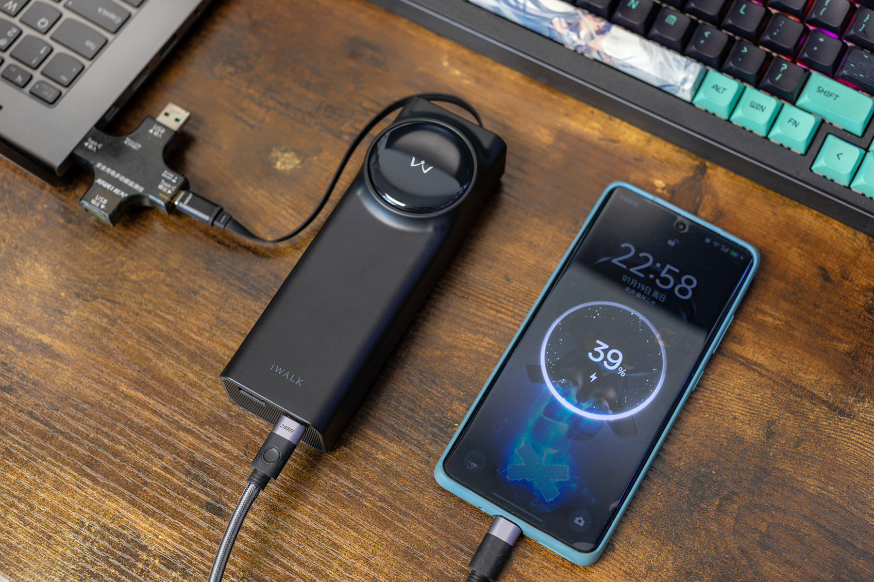 对于经常出差的我来说,难免会遇到手机或笔记本电量不足的现象。普通的充电宝由于输出功率不足,无法满足笔记本的所用。所以,能够给笔记本充电的充电宝也成了我出行必带的装备之一。 我手上这款iWALK拉拉宝MAX是我比较心仪的一款充电宝。它的体积不大,但容量却有20000mAh,可以直接带上飞机。另外,iWALK拉拉宝MAX不仅支持65W双向快充,可以迅速回血,还自带70cm长的伸缩线,使用时需要多长拉多长,非常的方便。以后再也不用为线材放在包包里缠绕或是忘带而烦恼了。 在实际使用方面,iWALK拉拉宝MAX可同时给3台设备充电。通过实测,我在使用充电宝自带的伸缩线给笔记本充电时,它的输出功率基本都能维持在50W以上。如果同时给手机和蓝牙耳机等设备进行充电,也能够保证笔记本的正常使用。 而且,iWALK拉拉宝MAX还带有电量显示,可随时查看剩余电量。我给手机充电从40%到65%仅用了十多分钟,而充电宝的电量仅消耗了8%。这样算下来,使用它不仅充电快,还可以给我的手机充电约3次以上。以上,有它在手,再也不用担心出行电量问题啦