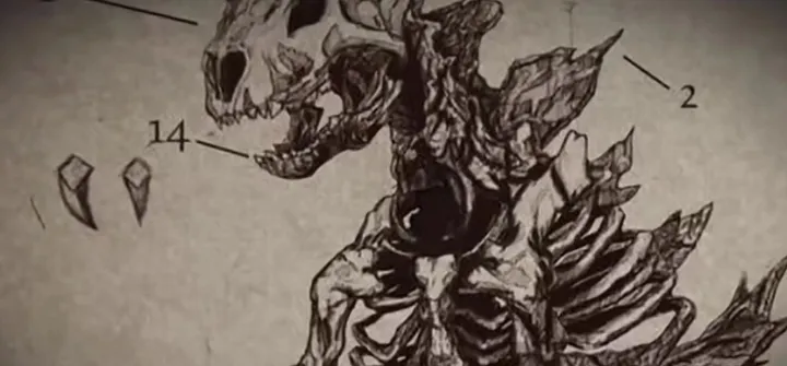 这张图是14年哥斯拉中人类第一次发现哥斯拉,该骨架和原子恐龙一脉的怪兽达贡颇为类似,在原著故事背景中它死于制作穆托的寄生,其出生年代甚至比哥斯拉还要古老。