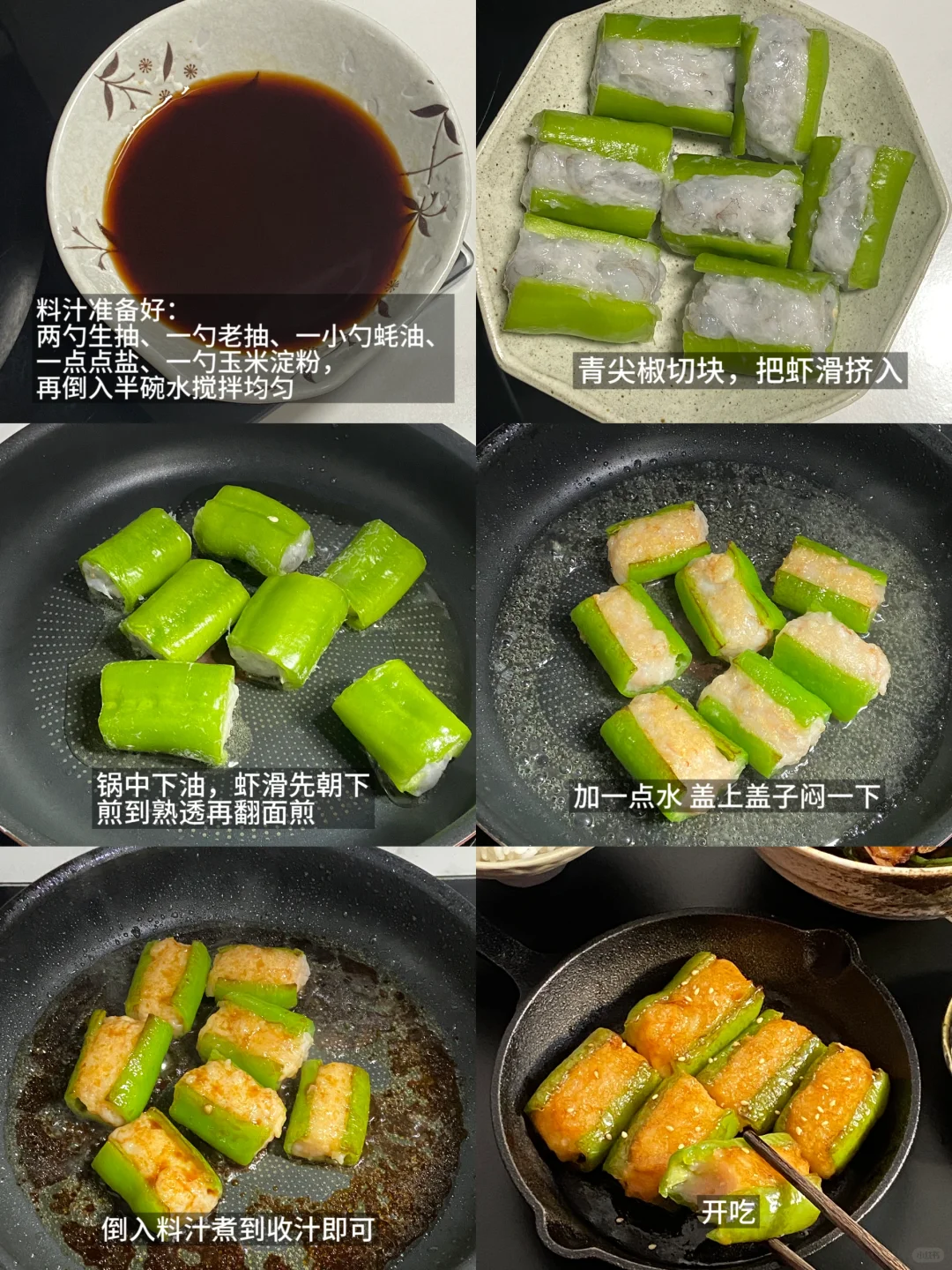 2)青尖椒切块,把虾滑挤入,锅中下油,虾滑先朝下煎到熟透再翻面煎,倒入料汁煮到收汁即可
