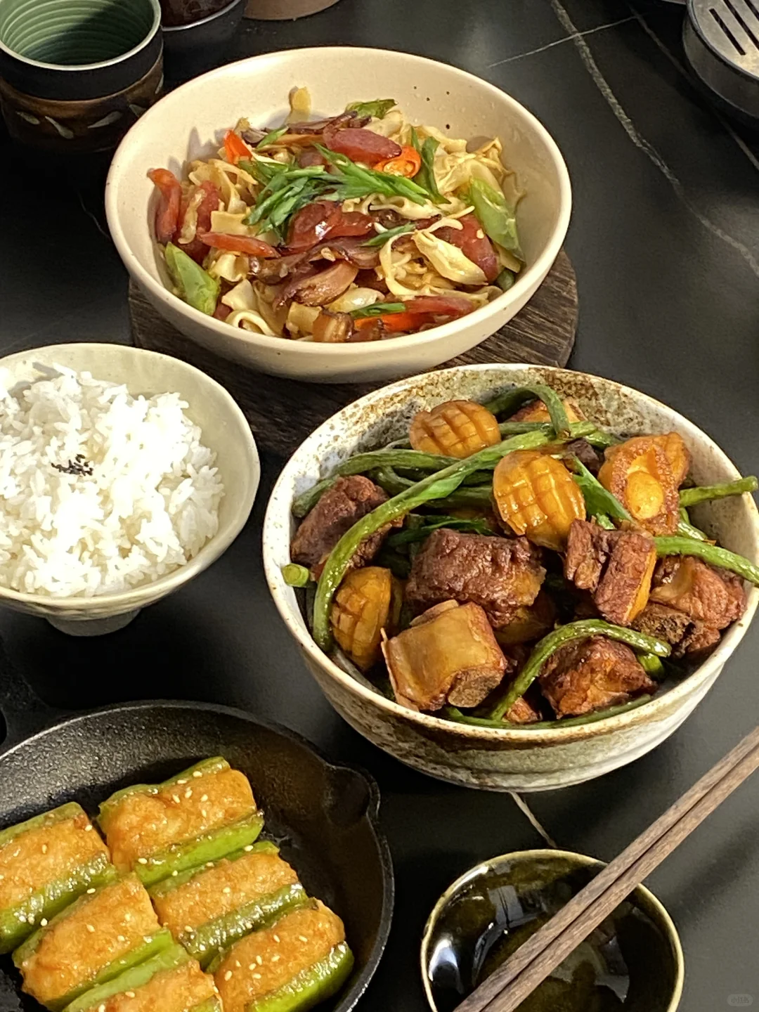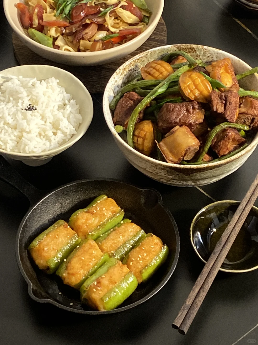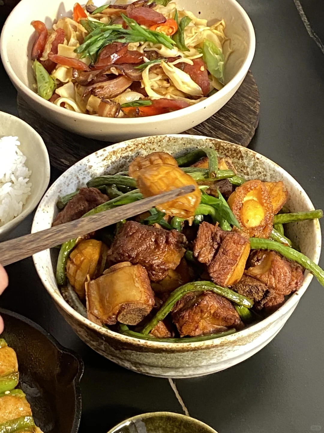 年饭菜谱📜豆角烧排骨 腊肉炒笋 青椒酿虾滑