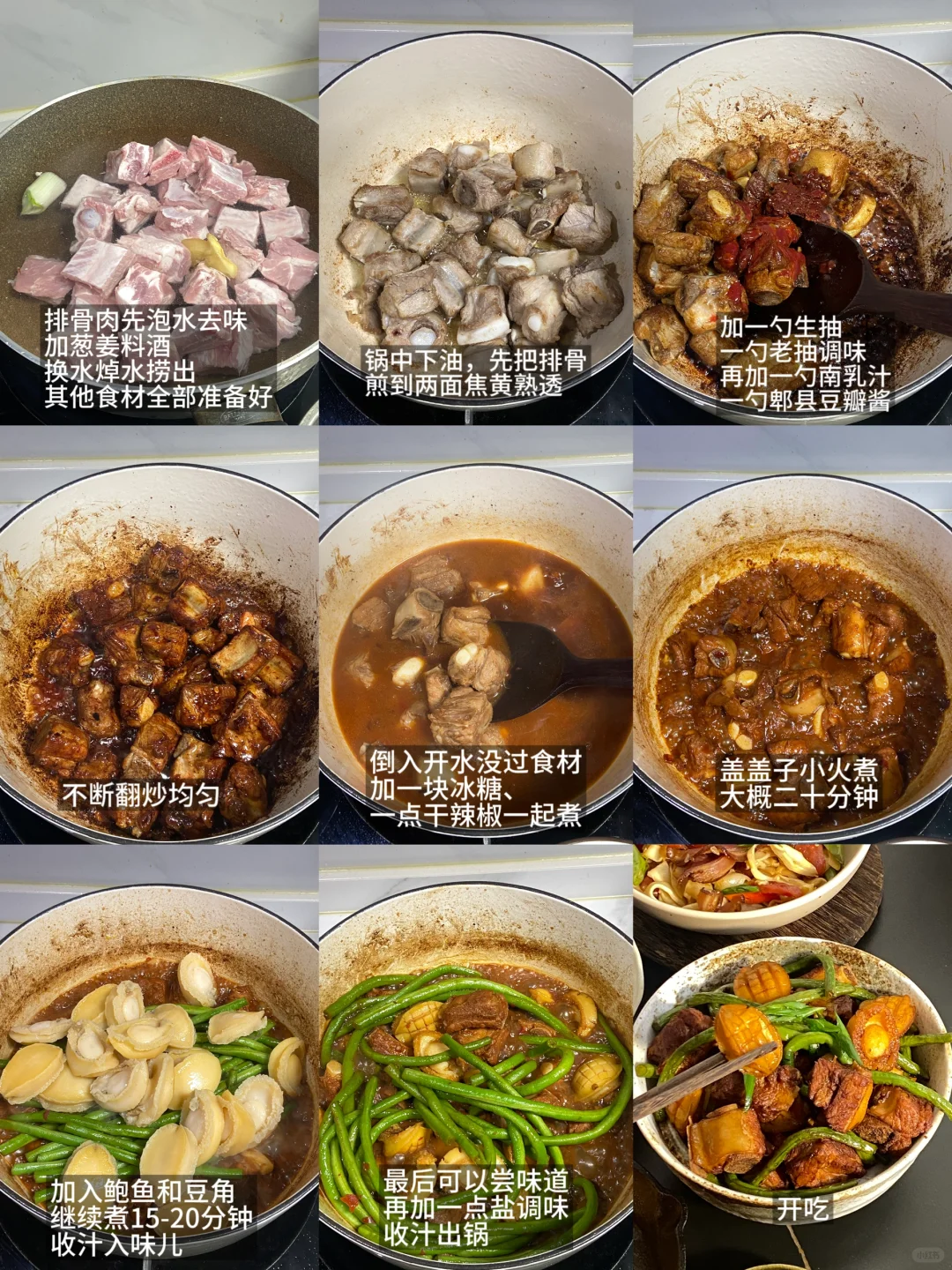 肋排3条|鲍鱼|豆角|葱|姜|郫县豆瓣酱|南乳汁|生抽|老抽|冰糖|干辣椒
