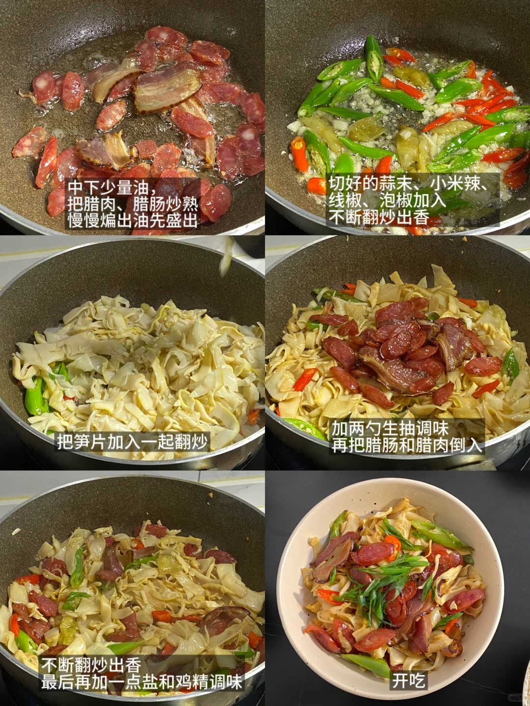 1)这次用的是笋片,如果是鲜笋要提前焯一下水去涩,锅中下少量油,把腊肉、腊肠炒熟,慢慢煸出油,炒菜很香