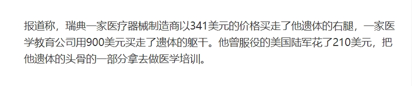 刚看环球时报一条炸裂消息啊,美军老兵流浪死在街头,然后他的遗体被切分成多块出售!有没有搞错,这是新闻报道还是恐怖小说啊? 这篇报道曝光,美国北得克萨斯大学,健康科学中心从2019年开始,就在当地政府的默许下,把无人认领的遗体, 拿去卖钱! 那名美军老兵维克多·霍尼,流浪死在街头,按照美军规定,身为退伍军人的维克多是可以免费下葬的,但是他的遗体被那个中心接收,注意啊,这个老兵是有家人的!但是中心并没有通知他的家人,而是把他的右腿以341美元卖给了瑞典一家医疗器械商,900美元把躯干卖给一家医学教育公司,而他头骨的一部分,则是以200美元卖给了他曾经服役的美国陆军,好家伙,生是美军的人,死是美军的死人是吧? 统计数据是,经这个中心出售的遗体共有1500多具,其中32具,是本应由美军免费下葬的退伍军人。 那么,这么炸裂的事件,处理结果是什么呢?结果是,这个健康科学中心的负责人西尔维娅·特伦特·亚当斯决定辞职,理由是因为“个人原因”,没啦! 另外要提一句,这个西尔维娅·特伦特·亚当斯,曾是美国海军少将!所以说,我卖我手下的兵,关你们什么事?