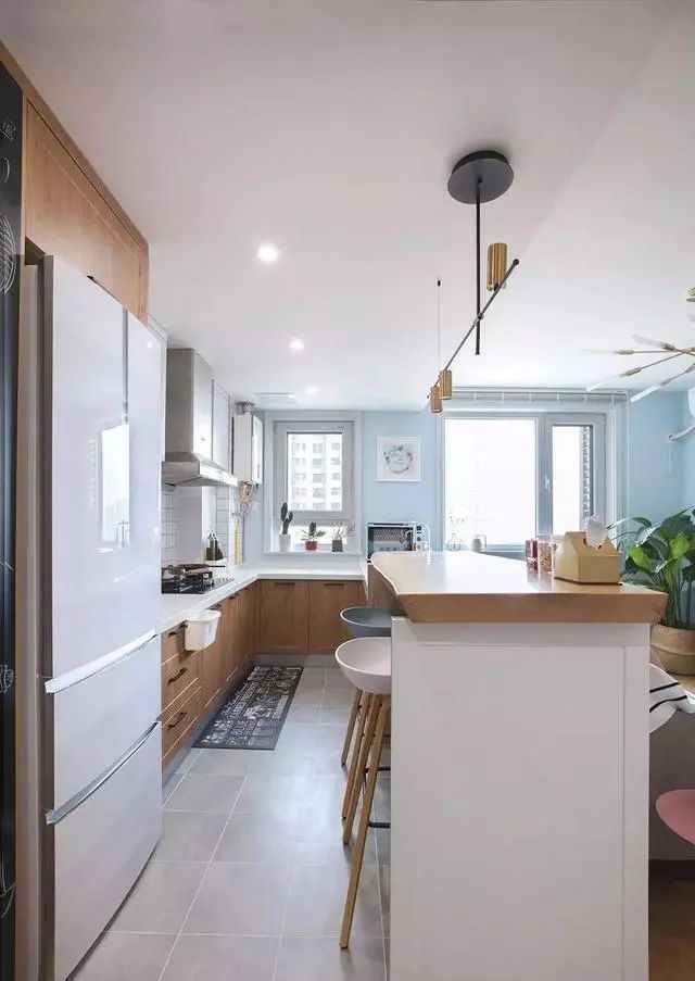 玄关进来的左手边就是开放式的厨房,玄关柜的旁边是嵌入式的冰箱,进来是操作区,这样U字型的厨房设计,充分利用了空间,功能性也很强。