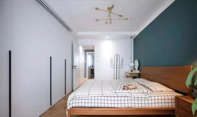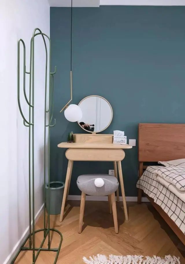 放弃了对称的床头柜,一边是小小的梳妆台,满足女主人日常用。还有超有特色的仙人掌形的衣架,让这个卧室变得更加文艺。