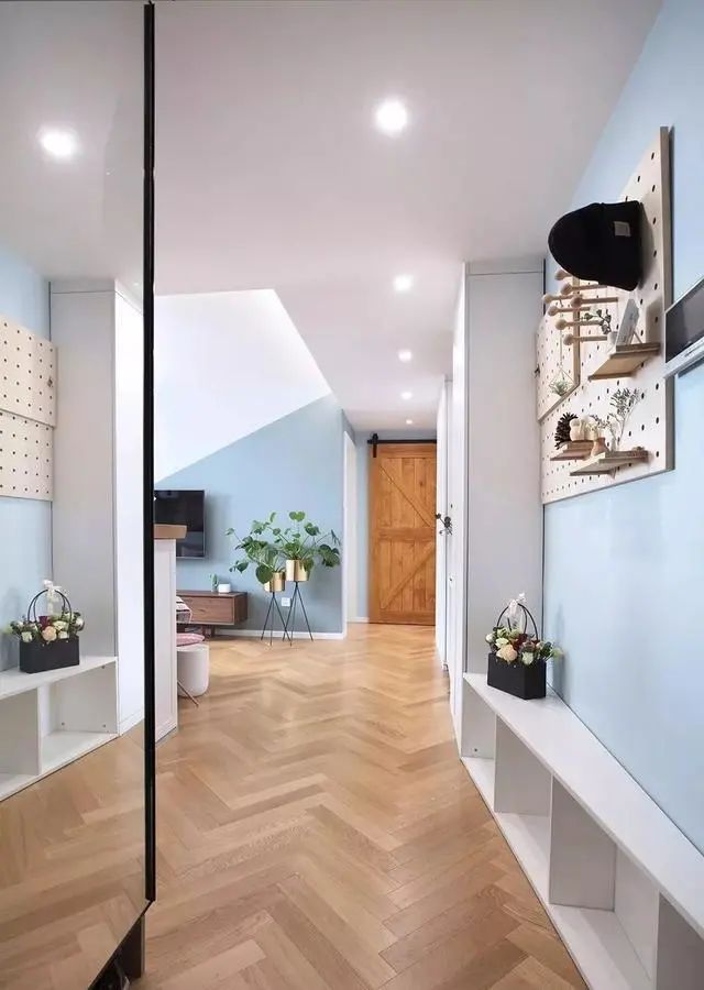 玄关空间没有很大,设计师就设计了一面异形的换鞋凳,一面容量大的储物柜,用来收纳换季鞋子,柜面做成穿衣镜,进出的时候更方便。换鞋凳上方采用目前很流行的洞洞板,可以摆放一些装饰品和帽子包包等。