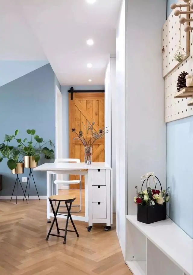 玄关正面进来就是餐厅,餐厅的空间比较小,选择了一款宜家折叠餐桌,平时折叠起来放在两个柜子中间刚刚好,不占位置。