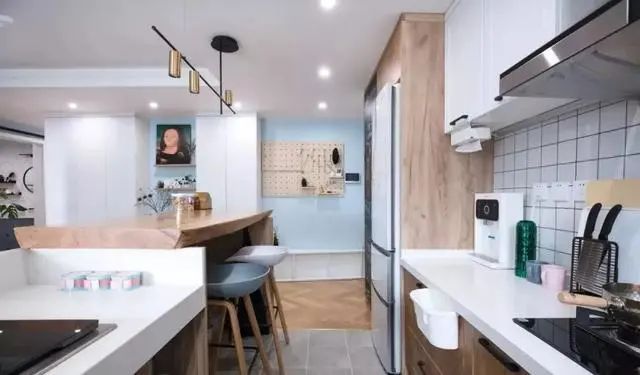 厨房另一面台面是一个吧台,这款实木的吧台台面,是一块完整的实木板材,纹理自然造型优美,闲暇时两人坐着聊聊天也是很舒服的。