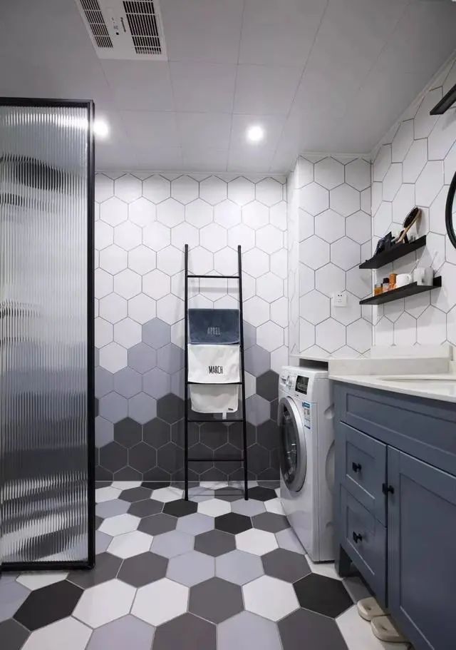 卫生间用性感的长虹玻璃做隔断,精致感飙升,解决了一人洗澡一人上厕所的尴尬,进卫生间后左边是淋浴房和马桶,右边是洗漱池和洗衣机。六边形的地砖,从地面延伸到墙面,时尚美观且有趣。